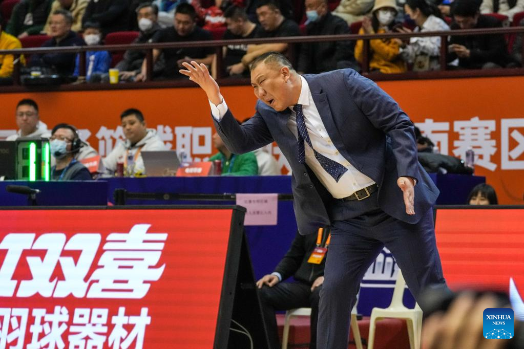 Wang Han, head coach of Shandong Heroes, gestures during the 29th round match between Shandong Heroes and Liaoning Flying Leopards at the 2022-2023 season of the Chinese Basketball Association (CBA) league in Jinan, capital of east China's Shandong Province, March 1, 2023. (Xinhua/Zhu Zheng)