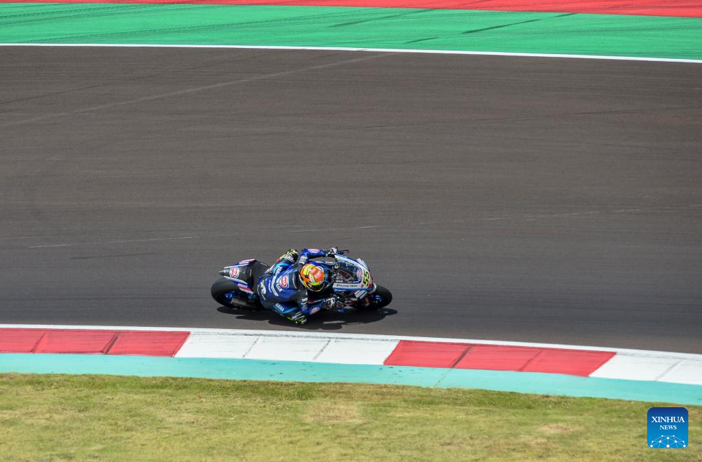 Italian rider Lorenzo Baldassarri of GMT94 Yamaha races during the 3rd free practice of WorldSBK 2023 Motul Indonesian Round at Mandalika Circuit, Mandalika of West Nusa Tenggara province in Indonesia, March 4, 2023. (Xinhua/Zulkarnain)