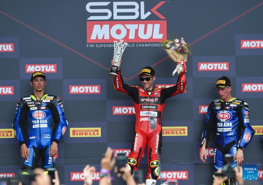 First-placed Spanish rider Alvaro Bautista (C) of Aruba.it Racing-Ducati, second-placed Toprak Razgatlioglu (L) of Türkiye from Pata Yamaha Prometeon WorldSBK and third-placed Italian rider Andrea Locatelli of Pata Yamaha Prometeon WorldSBK pose on the podium after Race 1 of WorldSBK 2023 Indonesian Round at Mandalika Circuit, Mandalika of West Nusa Tenggara province in Indonesia, March 4, 2023. (Xinhua/Zulkarnain)