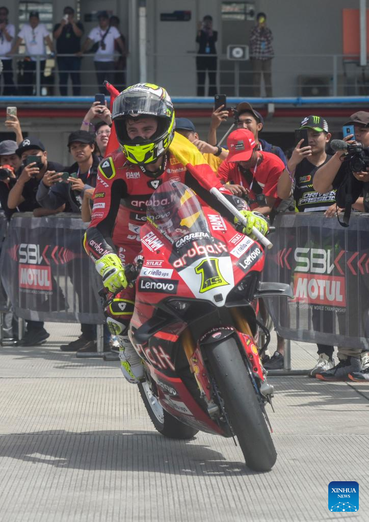 Spanish rider Alvaro Bautista of Aruba.it Racing-Ducati celebrates winning Race 1 of WorldSBK 2023 Indonesian Round at Mandalika Circuit, Mandalika of West Nusa Tenggara province in Indonesia, March 4, 2023. (Xinhua/Zulkarnain)