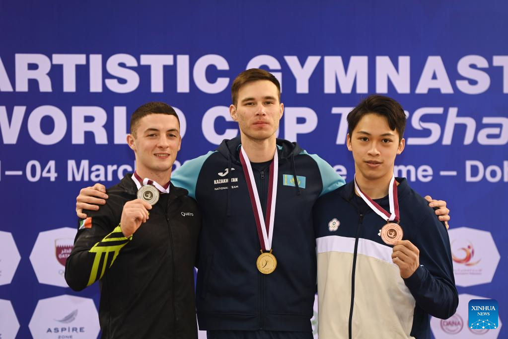 Gold medalist Nariman Kurbanov (C) of Kazakhstan, silver medalist Rhys Mc Clenaghan (L) of Ireland and bronze medalist Shiao Yu-Jan of Chinese Taipei pose during the awarding ceremony after the pommel horse final at the 15th FIG Artistic Gymnastics World Cup in Doha, Qatar, March 3, 2023. (Photo by Nikku/Xinhua)