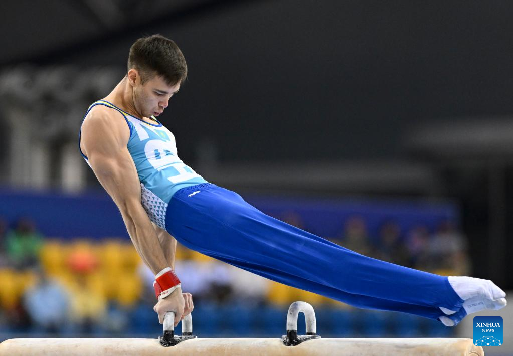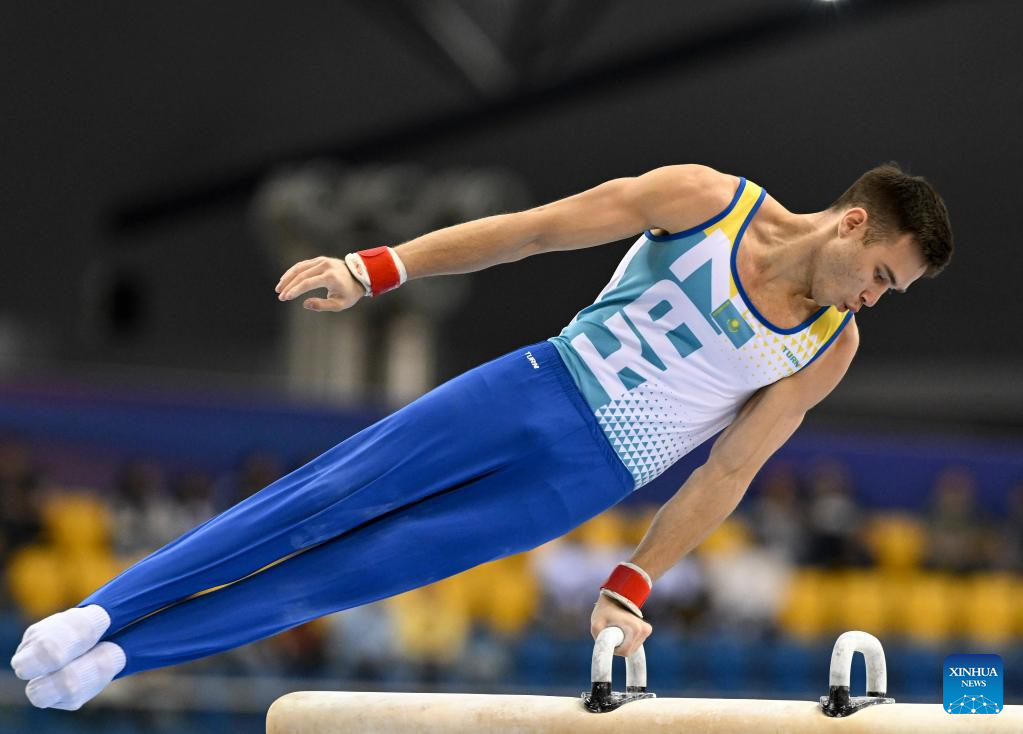 Nariman Kurbanov of Kazakhstan competes during the pommel horse final at the 15th FIG Artistic Gymnastics World Cup in Doha, Qatar, March 3, 2023. (Photo by Nikku/Xinhua)