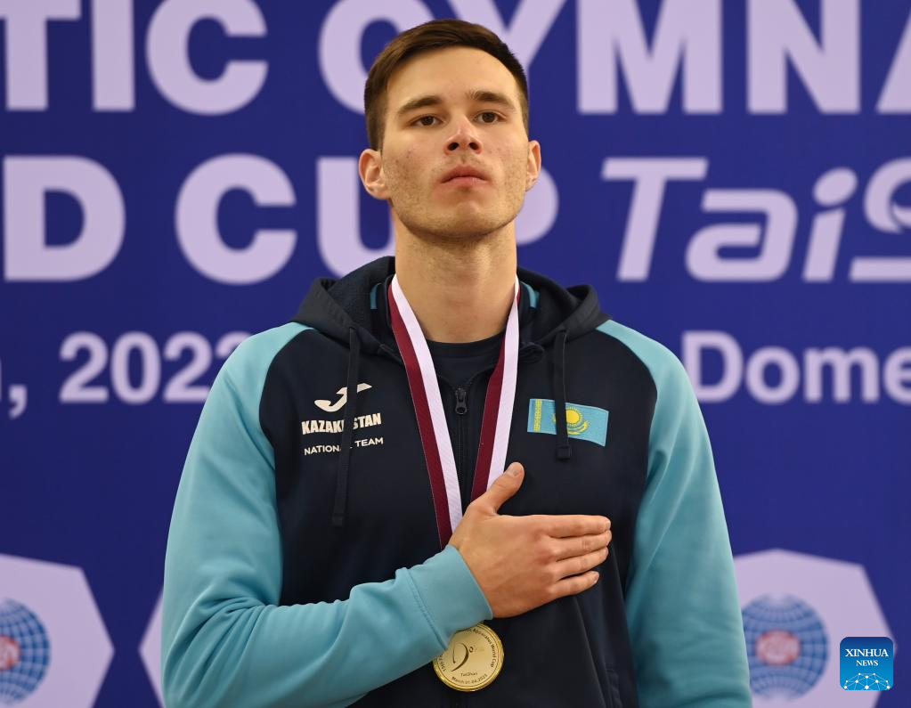 Gold medalist Nariman Kurbanov of Kazakhstan poses during the awarding ceremony after the pommel horse final at the 15th FIG Artistic Gymnastics World Cup in Doha, Qatar, March 3, 2023. (Photo by Nikku/Xinhua)