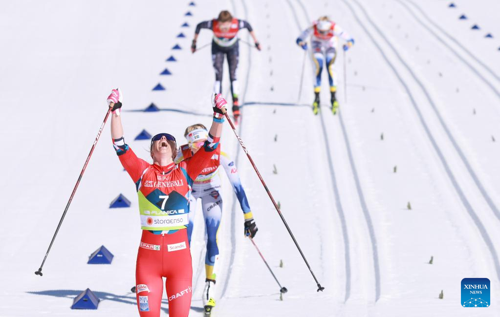 Ebba Andersson of Sweden celebrates after winning the first place of the Women's 30km Mass Start Classic of Cross-Country skiing competition at the FIS Nordic World Ski Championships in Planica, Slovenia, March 4, 2023. (Photo by Zeljko Stevanic/Xinhua)