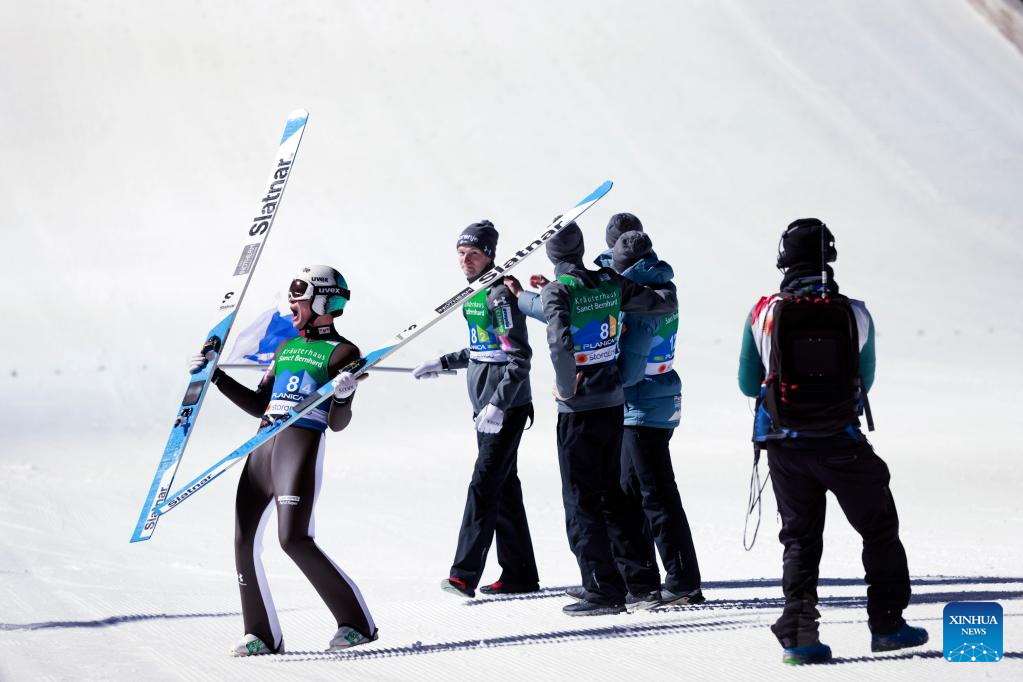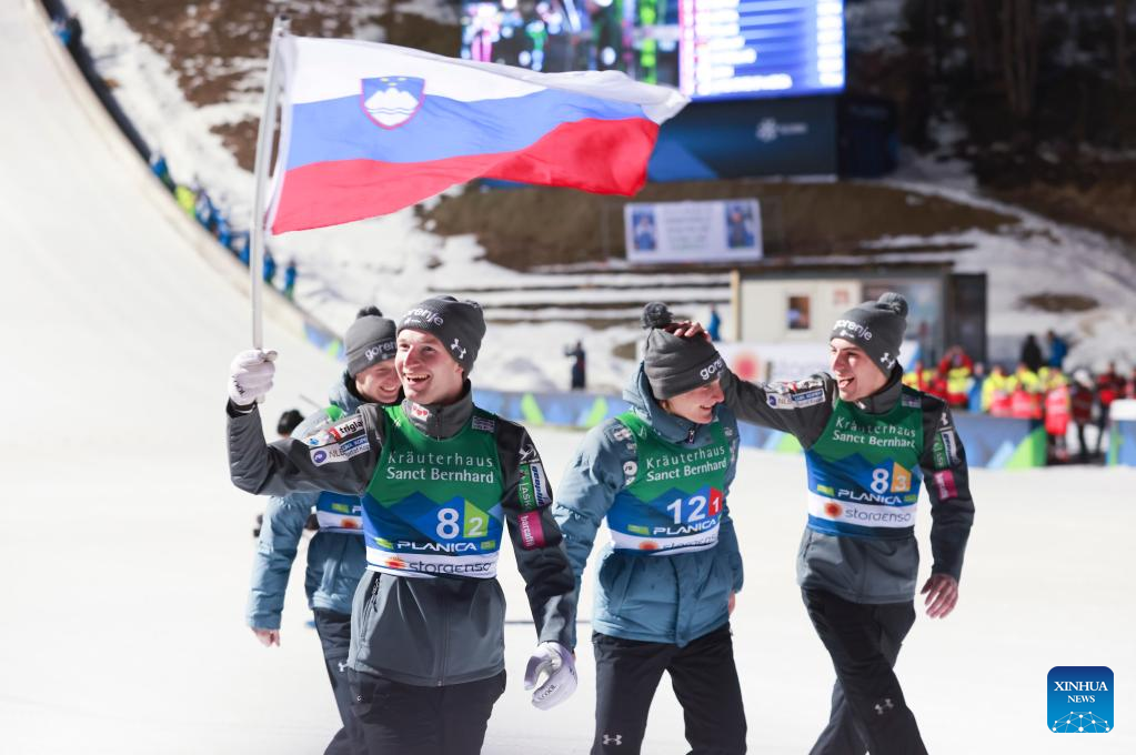 Anze Lanisek of Slovenia (L) celebrates after Slovenian team winning the men's Ski Jumping Team HS138 at the FIS Nordic World Ski Championships in Planica, Slovenia, March 4, 2023. (Photo by Zeljko Stevanic/Xinhua)