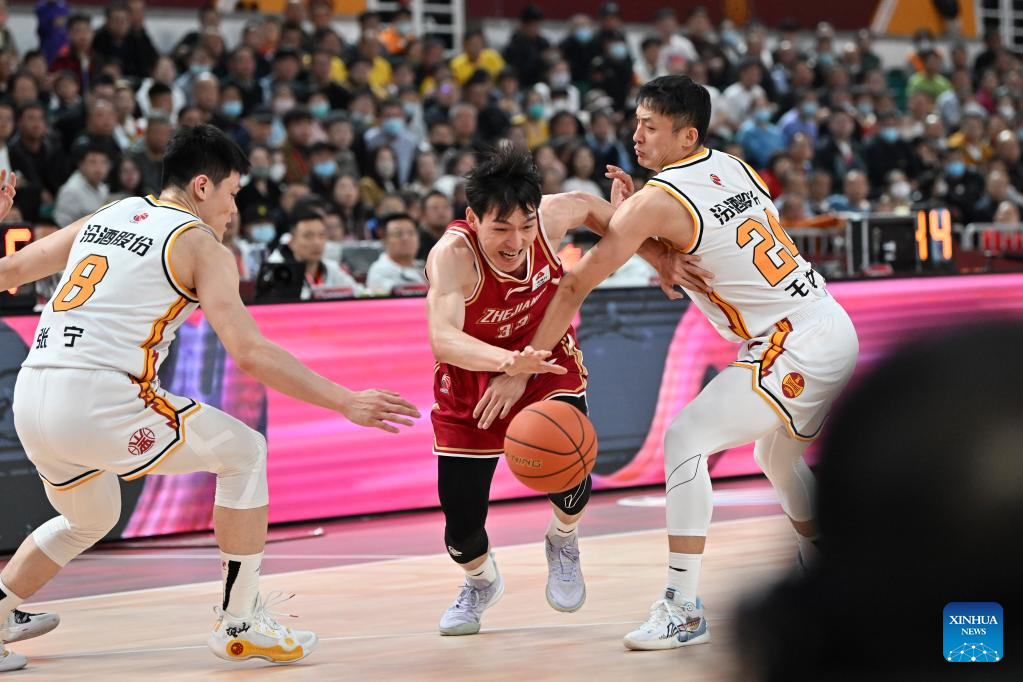 Wu Qian (C) of Zhejiang Golden bulls breaks through during the 31st round match between Shanxi Loongs and Zhejiang Golden bulls at the 2022-2023 season of the Chinese Basketball Association (CBA) league in Taiyuan, capital city of north China's Shanxi Province, March 5, 2023. (Xinhua/Zhan Yan)