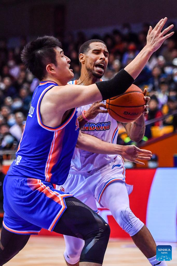 Sylven Landesberg (R) of Shandong Heroes breaks through during the 31st round match between Shandong Heroes and Sichuan Blue Whales at the 2022-2023 season of the Chinese Basketball Association (CBA) league in Jinan, capital of east China's Shandong Province, March 5, 2023. (Xinhua/Zhu Zheng)