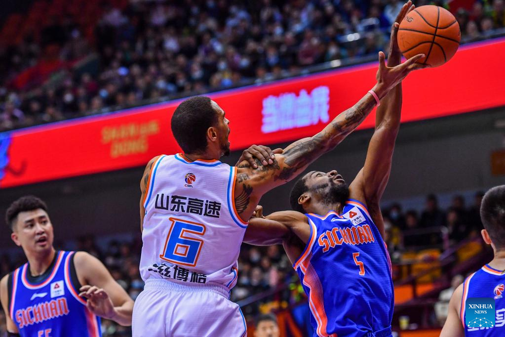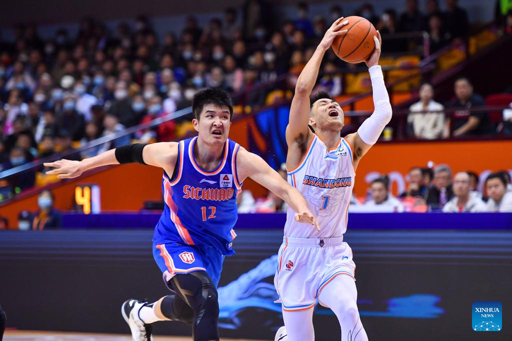 Gao Shiyan (R) of Shandong Heroes vies for the ball against Zhang Dianliang of Sichuan Blue Whales during their 31st round match at the 2022-2023 season of the Chinese Basketball Association (CBA) league in Jinan, capital of east China's Shandong Province, March 5, 2023. (Xinhua/Zhu Zheng)
