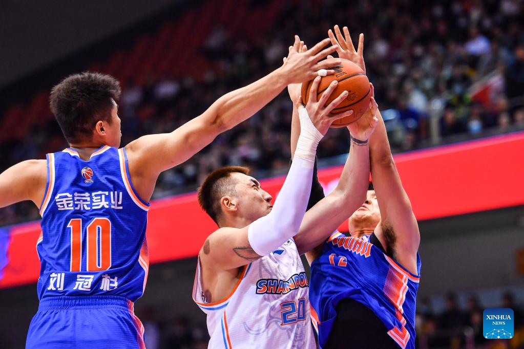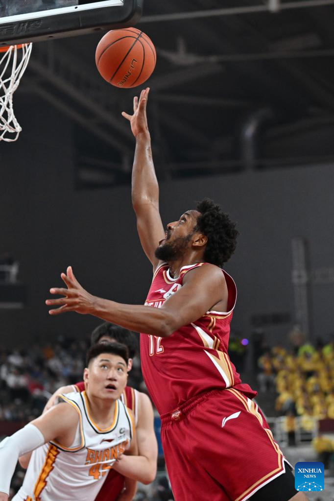 Tao Hanlin (C) of Shandong Heroes competes during the 31st round match between Shandong Heroes and Sichuan Blue Whales at the 2022-2023 season of the Chinese Basketball Association (CBA) league in Jinan, capital of east China's Shandong Province, March 5, 2023. (Xinhua/Zhu Zheng)