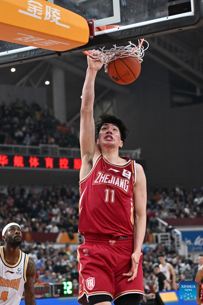 Yu Jiahao of Zhejiang Golden bulls dunks during the 31st round match between Shanxi Loongs and Zhejiang Golden bulls at the 2022-2023 season of the Chinese Basketball Association (CBA) league in Taiyuan, capital city of north China's Shanxi Province, March 5, 2023. (Xinhua/Zhan Yan)