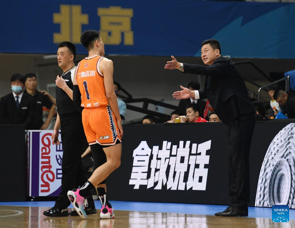 Li Chunjiang (R), head coach of Shanghai Sharks, talks with player Li Tianrong during the 31st round match between Beijing Ducks and Shanghai Sharks at the 2022-2023 season of the Chinese Basketball Association (CBA) league in Beijing, capital of China, March 5, 2023. (Xinhua/Zhang Chenlin)