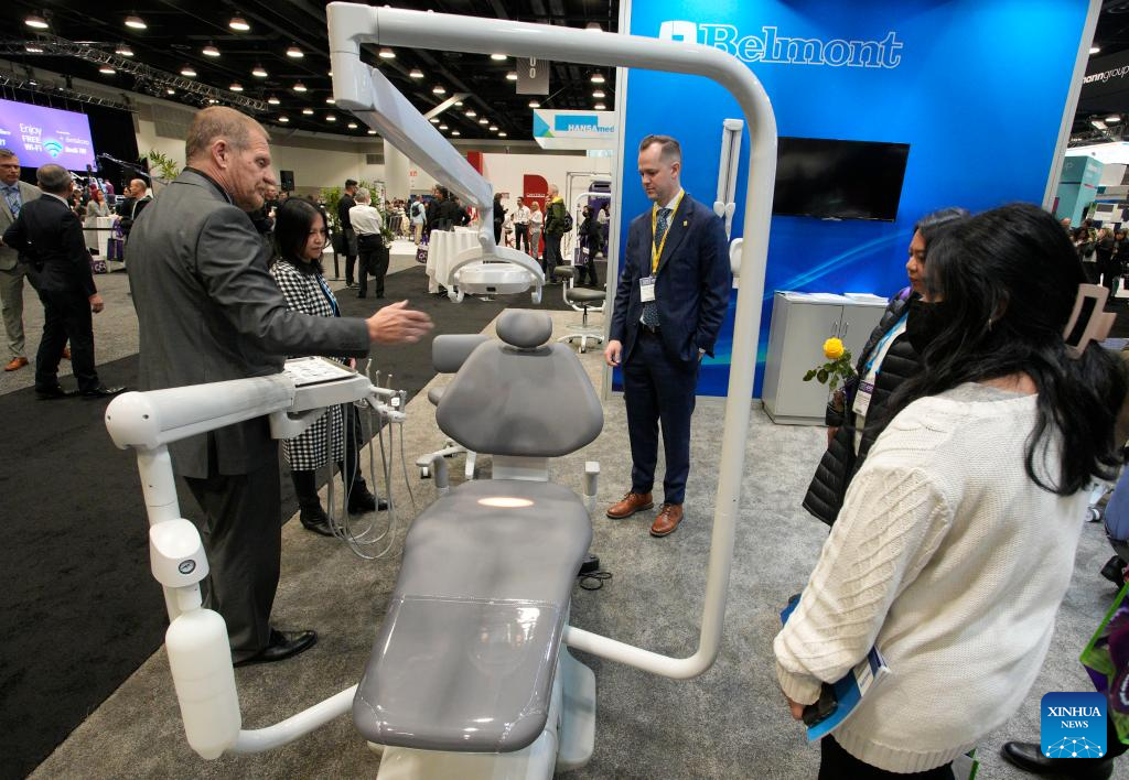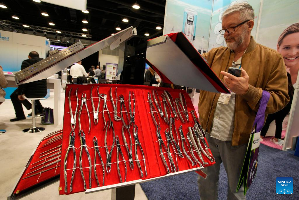 An attendee looks at dental equipment at the 2023 Pacific Dental Conference in Vancouver, British Columbia, Canada, on March 9, 2023. The three-day event featured a trade show with more than 225 exhibitors showcasing their latest products, technologies and services in the dental industry. (Photo by Liang Sen/Xinhua)