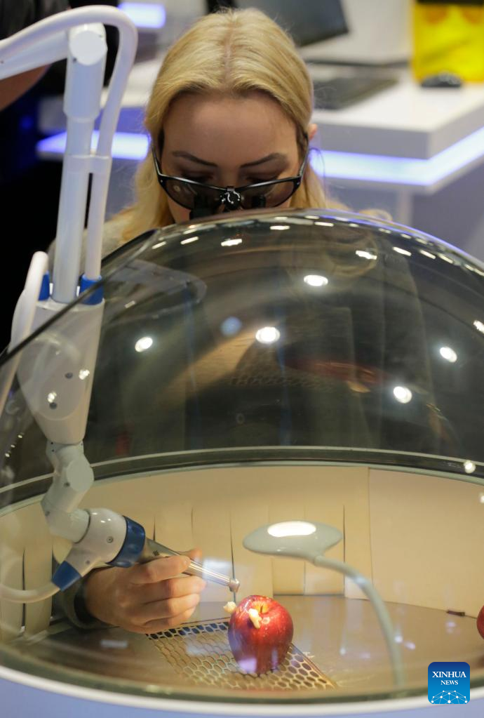 An attendee tries out some dental equipment at the 2023 Pacific Dental Conference in Vancouver, British Columbia, Canada, on March 9, 2023. The three-day event featured a trade show with more than 225 exhibitors showcasing their latest products, technologies and services in the dental industry. (Photo by Liang Sen/Xinhua)