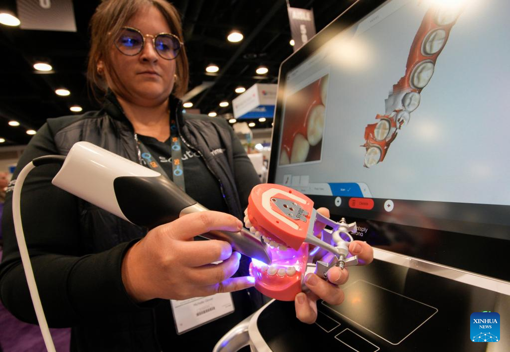 An exhibitor demonstrates a dental 3D scanner at the 2023 Pacific Dental Conference in Vancouver, British Columbia, Canada, on March 9, 2023. The three-day event featured a trade show with more than 225 exhibitors showcasing their latest products, technologies and services in the dental industry. (Photo by Liang Sen/Xinhua)