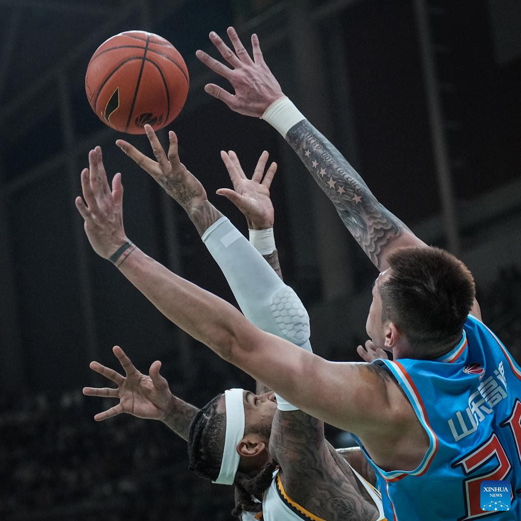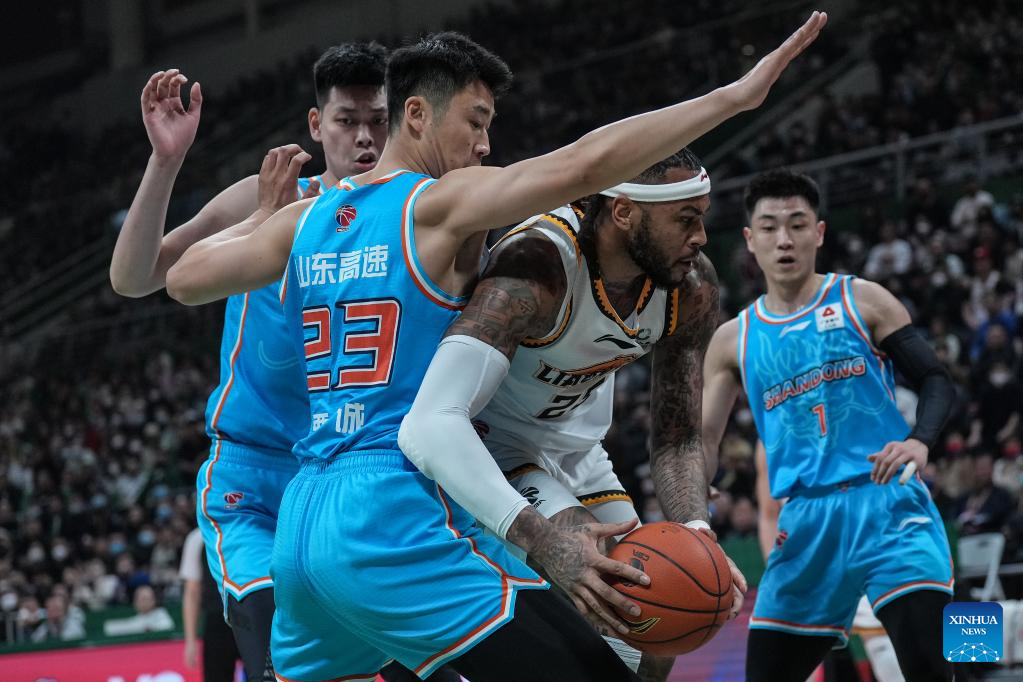Eric Moreland (C) of Liaoning Flying Leopards competes during the 33rd round match between Liaoning Flying Leopards and Shandong Heros at the 2022-2023 season of the Chinese Basketball Association (CBA) league in Shenyang of northeast China's Liaoning Province, March 10, 2023. (Xinhua/Pan Yulong)