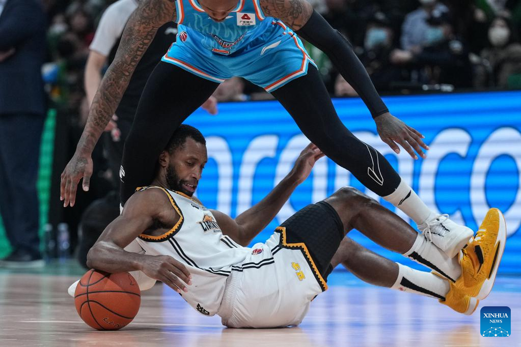 Kyle Fogg (bottom) of Liaoning Flying Leopards competes during the 33rd round match between Liaoning Flying Leopards and Shandong Heros at the 2022-2023 season of the Chinese Basketball Association (CBA) league in Shenyang of northeast China's Liaoning Province, March 10, 2023. (Xinhua/Pan Yulong)
