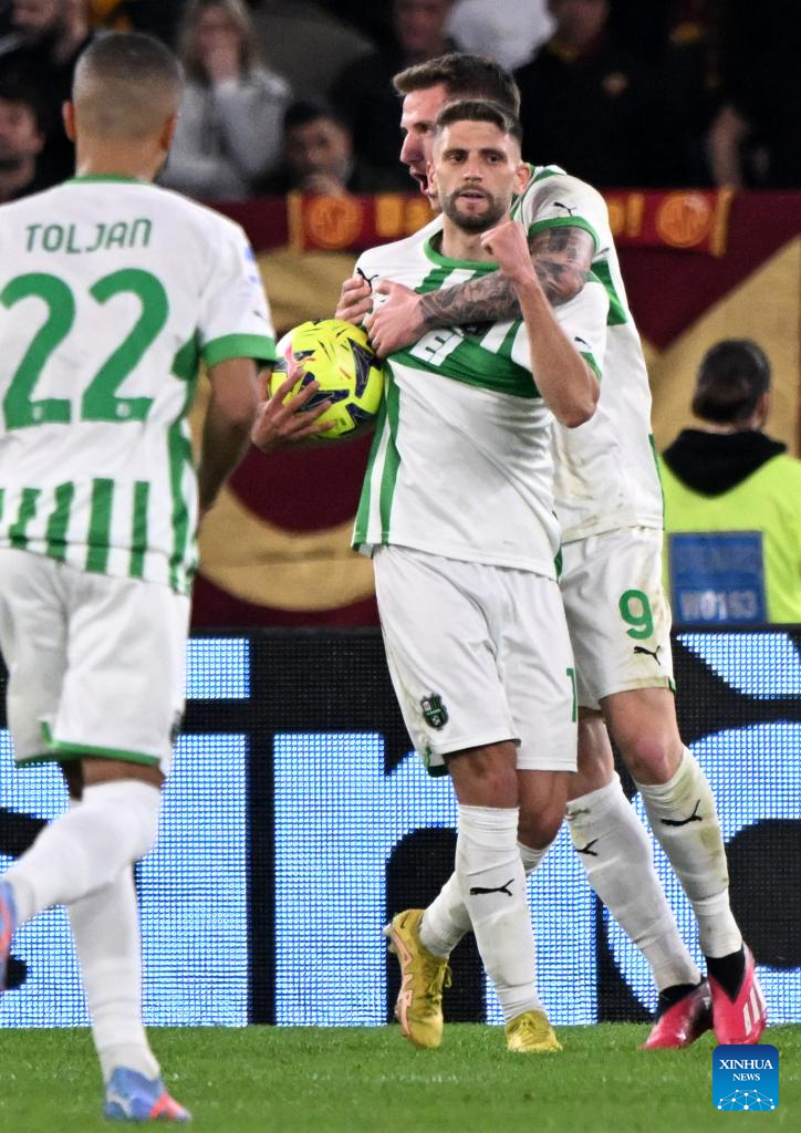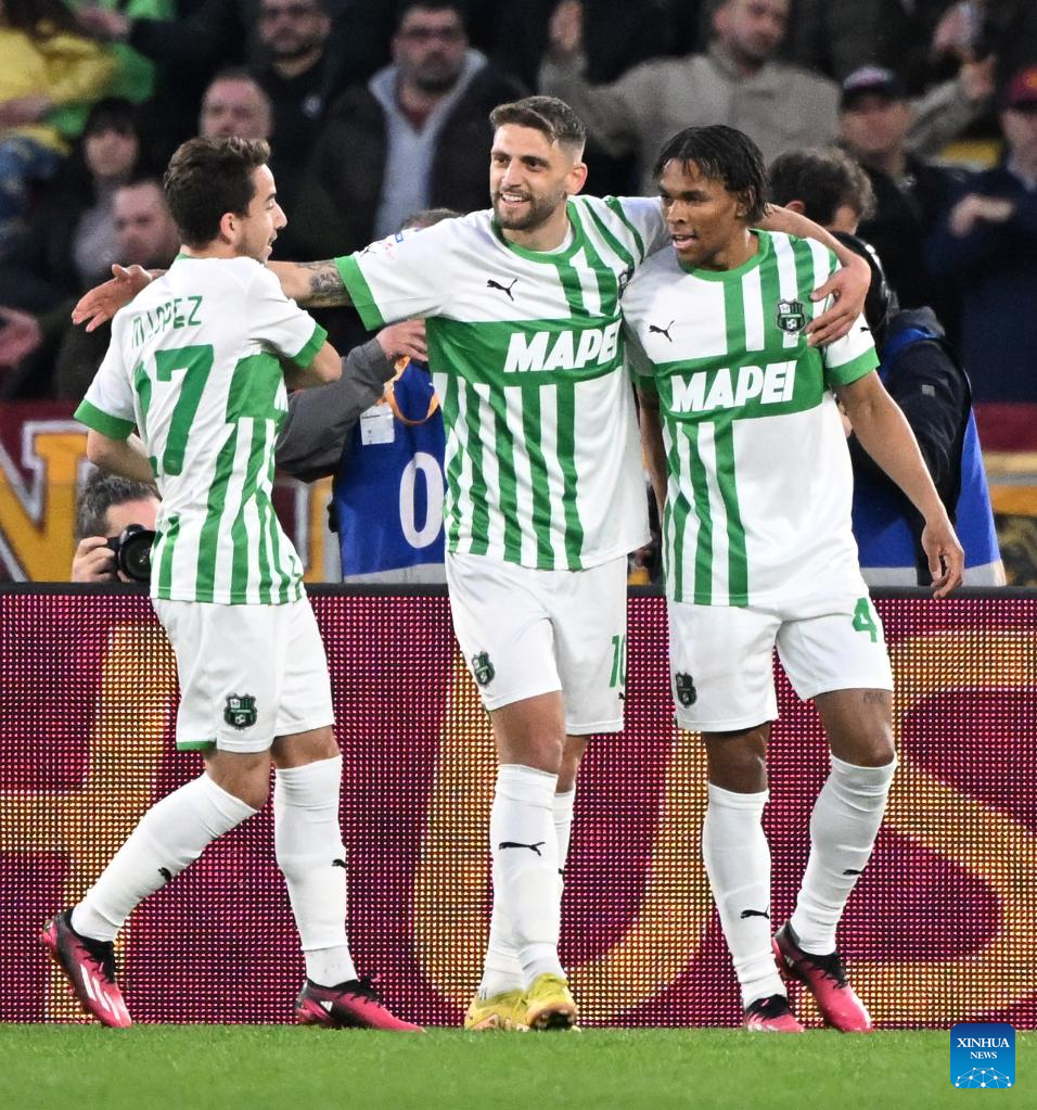 Sassuolo's Domenico Berardi (C) celebrates his goal during a Serie A football match between Roma and Sassuolo in Rome, Italy, on March 12, 2023. (Photo by Alberto Lingria/Xinhua)