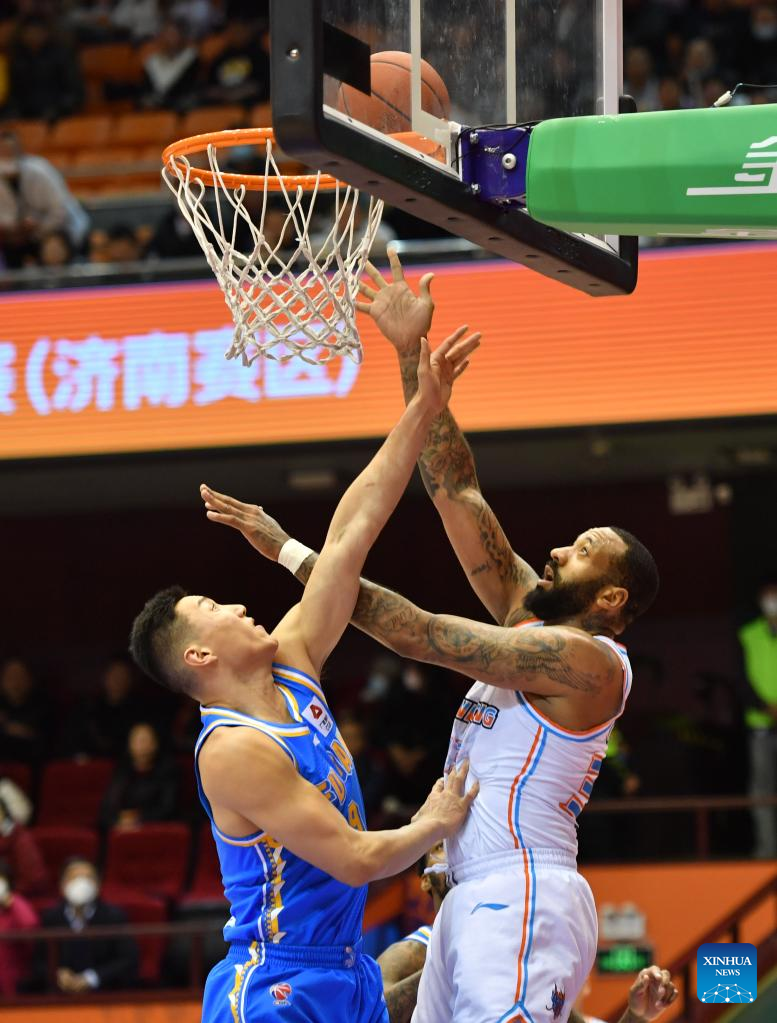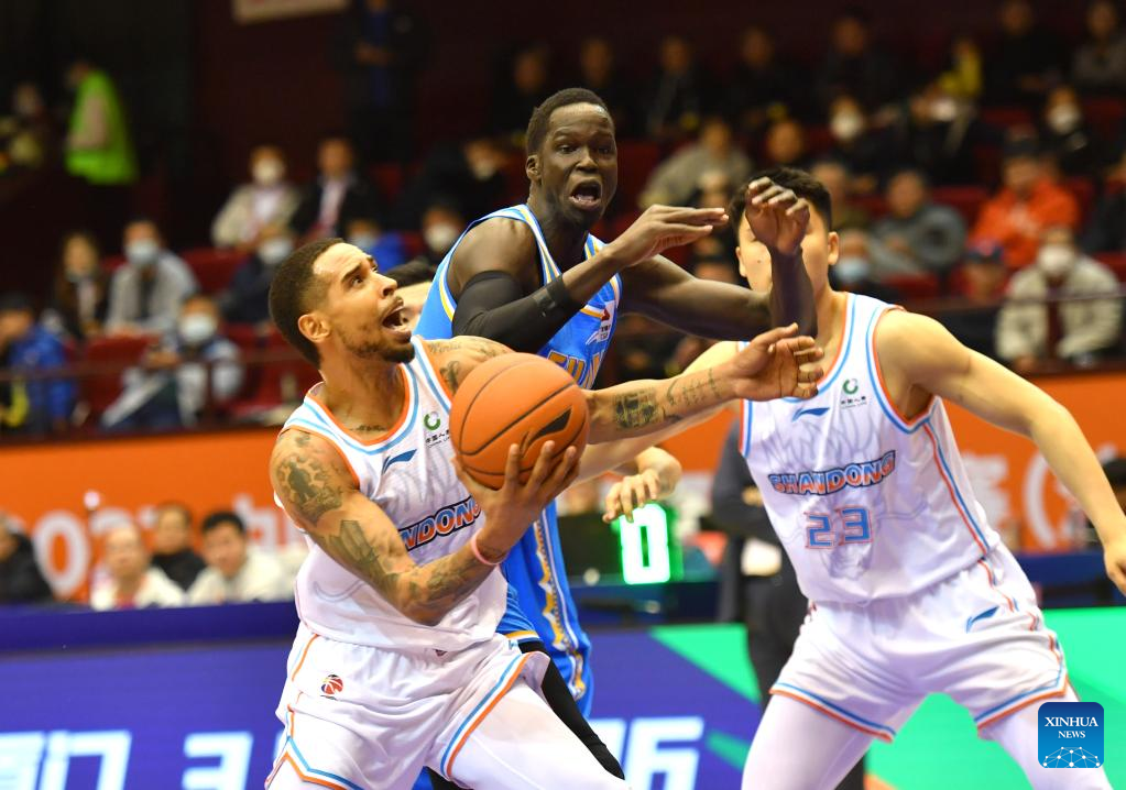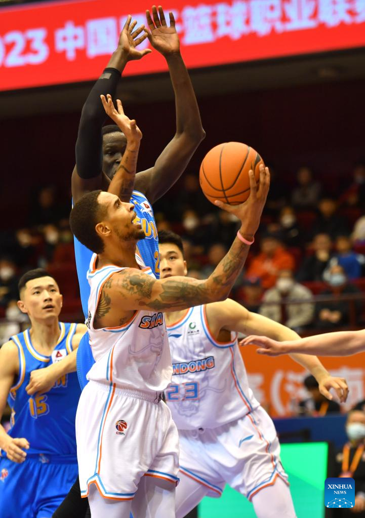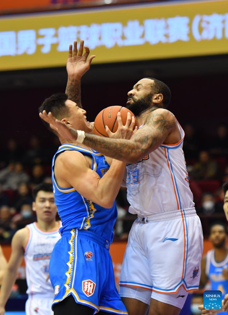 Troy Gillenwater (R) of Shandong Heroes vies for a rebound during the 34th round match between Shandong Heros and Fujian Sturgeons at 2022-2023 season of the Chinese Basketball Association (CBA) league in Jinan of east China's Shandong Province, March 12, 2023. (Xinhua/Xu Suhui)