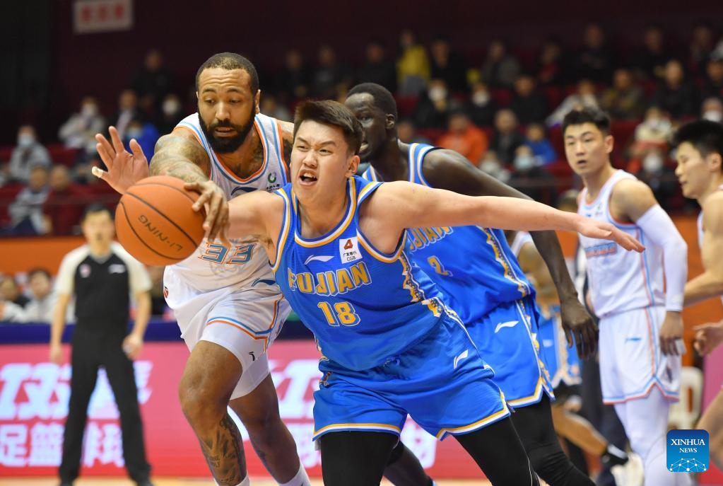 Wang Yixiong (L) of Fujian Sturgeons vies with Troy Gillenwater of Shandong Heroes during the 34th round match between Shandong Heros and Fujian Sturgeons at 2022-2023 season of the Chinese Basketball Association (CBA) league in Jinan of east China's Shandong Province, March 12, 2023. (Xinhua/Xu Suhui)