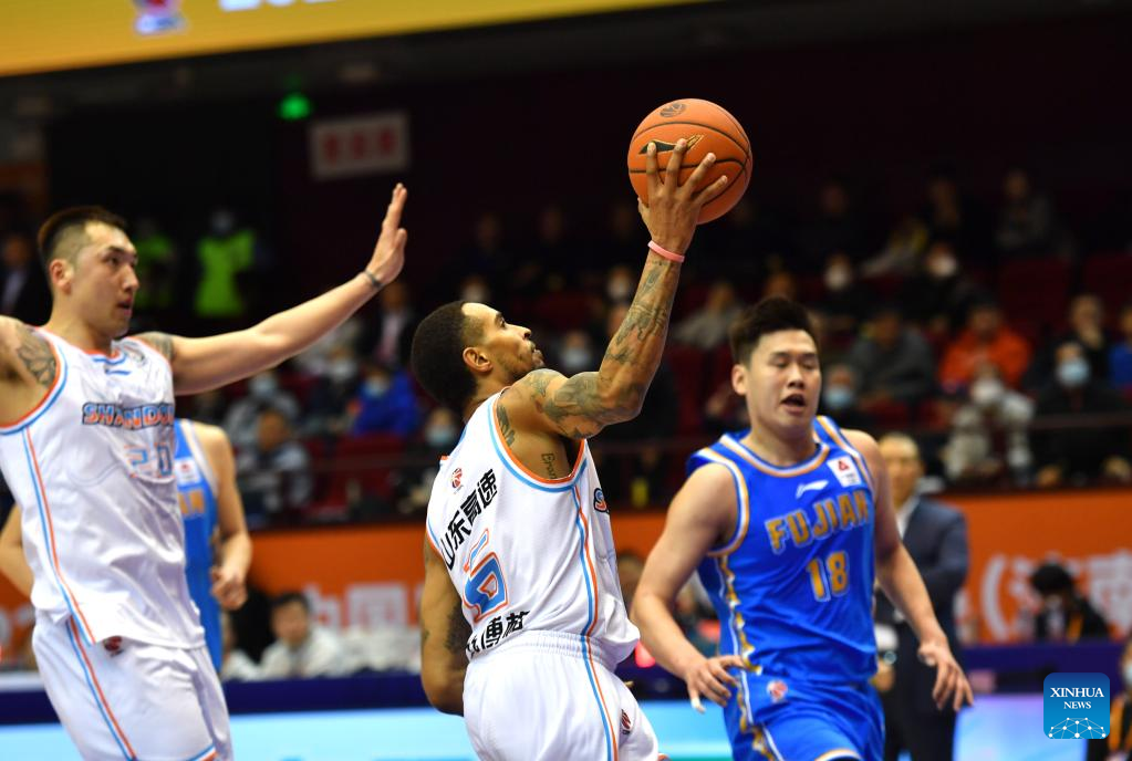 Sylven Landesberg (L) of Shandong Heroes goes for a lay-up during the 34th round match between Shandong Heros and Fujian Sturgeons at 2022-2023 season of the Chinese Basketball Association (CBA) league in Jinan of east China's Shandong Province, March 12, 2023. (Xinhua/Xu Suhui)