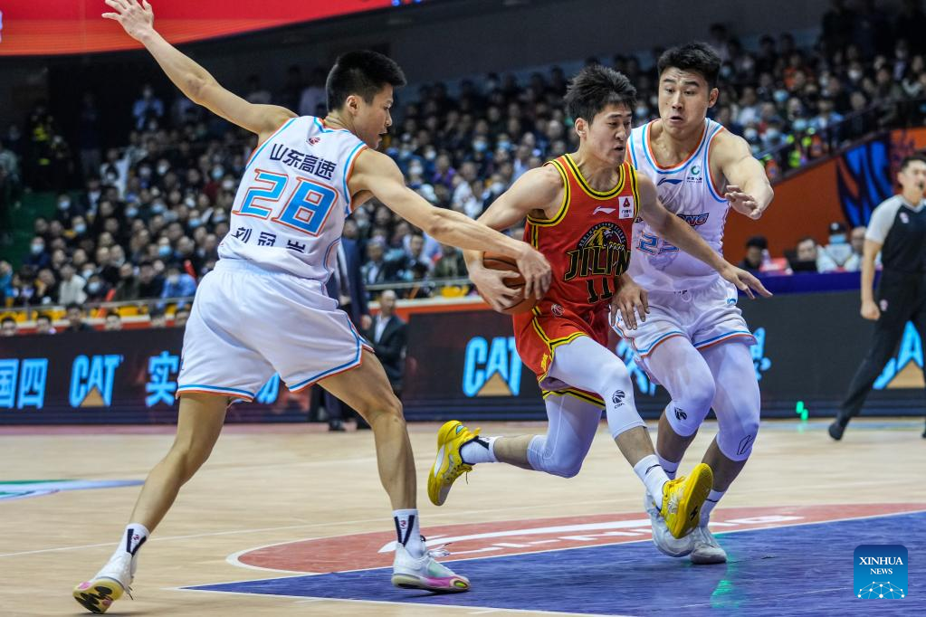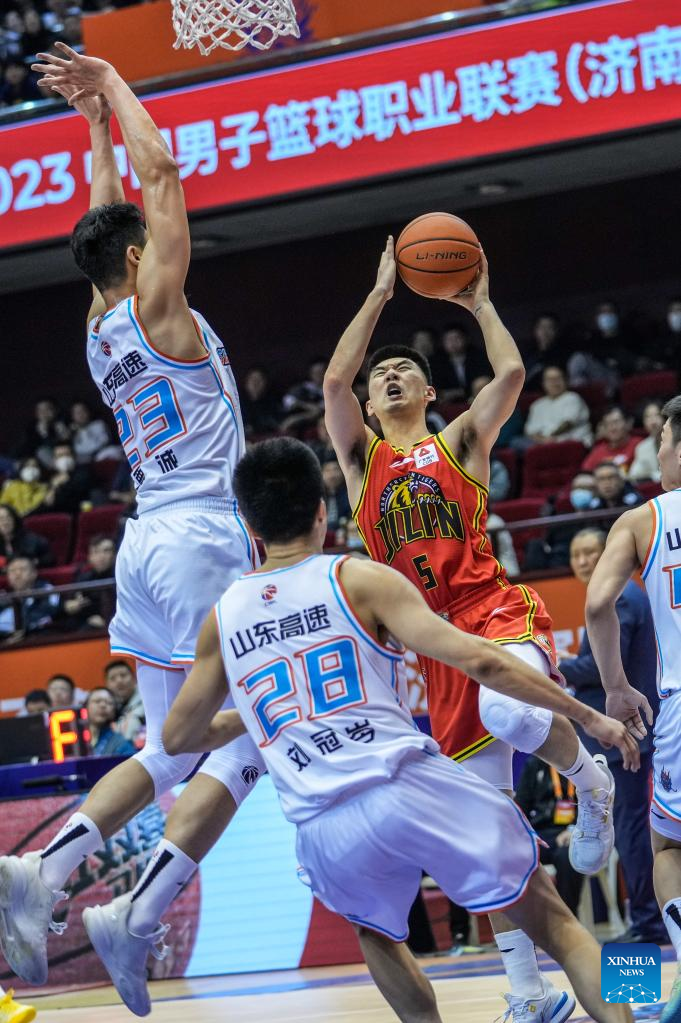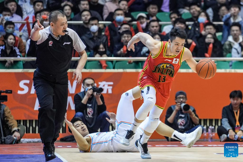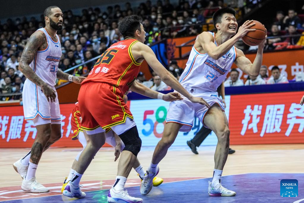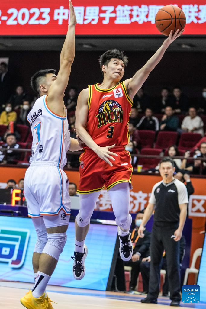 Liu Guancen (1st R) of Shandong Heroes competes during the 35th round match between Shandong Heroes and Jilin Northeast Tigers at the 2022-2023 season of the Chinese Basketball Association (CBA) league in Jinan, capital city of east China's Shandong Province, March 14, 2023. (Xinhua/Zhu Zheng)