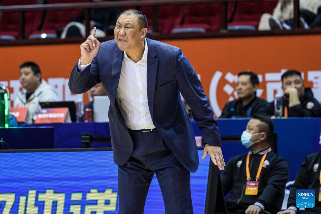Gao Junchao (C), head coach of Jilin Northeast Tigers, gestures during the 35th round match between Shandong Heroes and Jilin Northeast Tigers at the 2022-2023 season of the Chinese Basketball Association (CBA) league in Jinan, capital city of east China's Shandong Province, March 14, 2023. (Xinhua/Zhu Zheng)