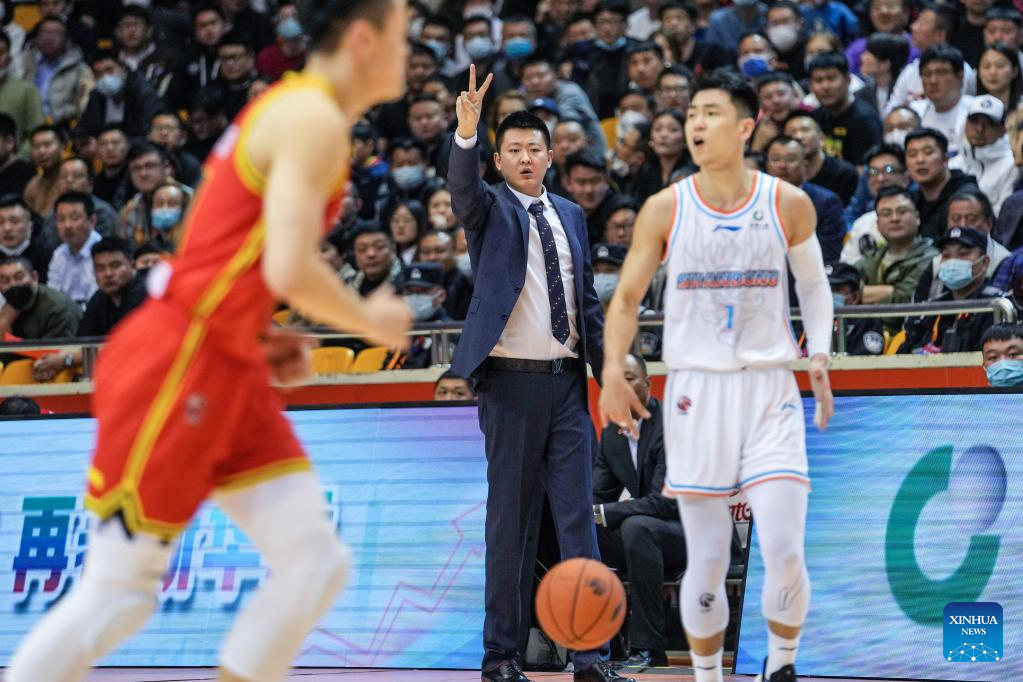 Wang Han, head coach of Shandong Heroes, gestures during the 35th round match between Shandong Heroes and Jilin Northeast Tigers at the 2022-2023 season of the Chinese Basketball Association (CBA) league in Jinan, capital city of east China's Shandong Province, March 14, 2023. (Xinhua/Zhu Zheng)