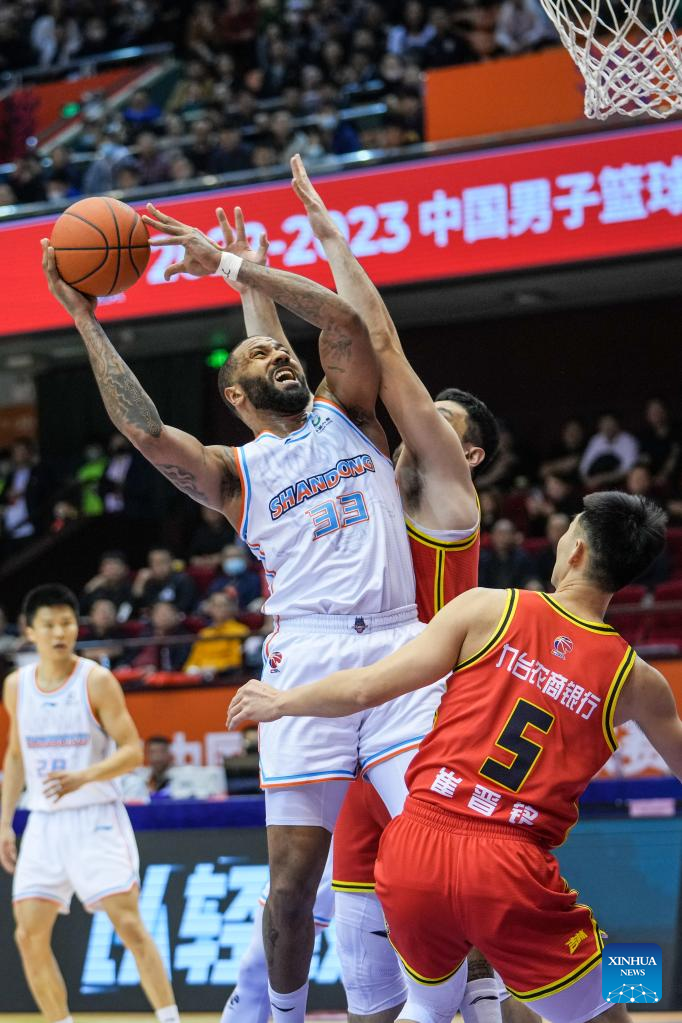 Troy Gillenwater (front R) of Shandong Heroes competes during the 35th round match between Shandong Heroes and Jilin Northeast Tigers at the 2022-2023 season of the Chinese Basketball Association (CBA) league in Jinan, capital city of east China's Shandong Province, March 14, 2023. (Xinhua/Zhu Zheng)