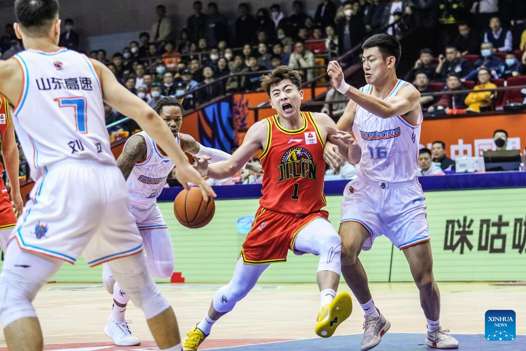 Jiang Weize (C) of Jilin Northeast Tigers breaks through during the 35th round match between Shandong Heroes and Jilin Northeast Tigers at the 2022-2023 season of the Chinese Basketball Association (CBA) league in Jinan, capital city of east China's Shandong Province, March 14, 2023. (Xinhua/Zhu Zheng)