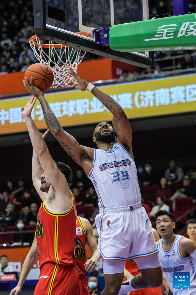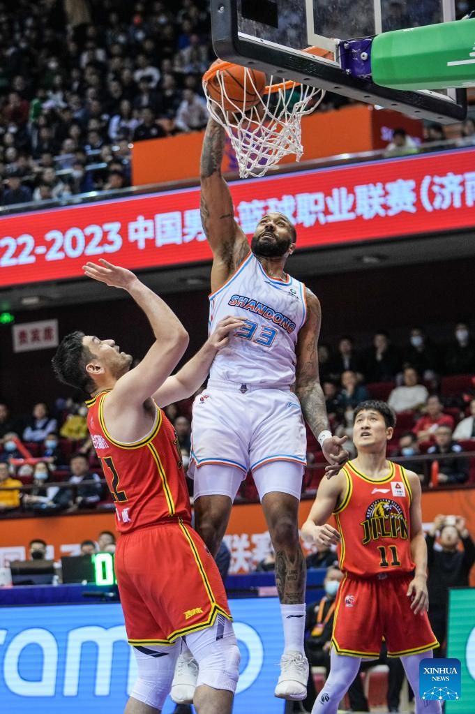 Troy Gillenwater (C) of Shandong Heroes dunks during the 35th round match between Shandong Heroes and Jilin Northeast Tigers at the 2022-2023 season of the Chinese Basketball Association (CBA) league in Jinan, capital city of east China's Shandong Province, March 14, 2023. (Xinhua/Zhu Zheng)