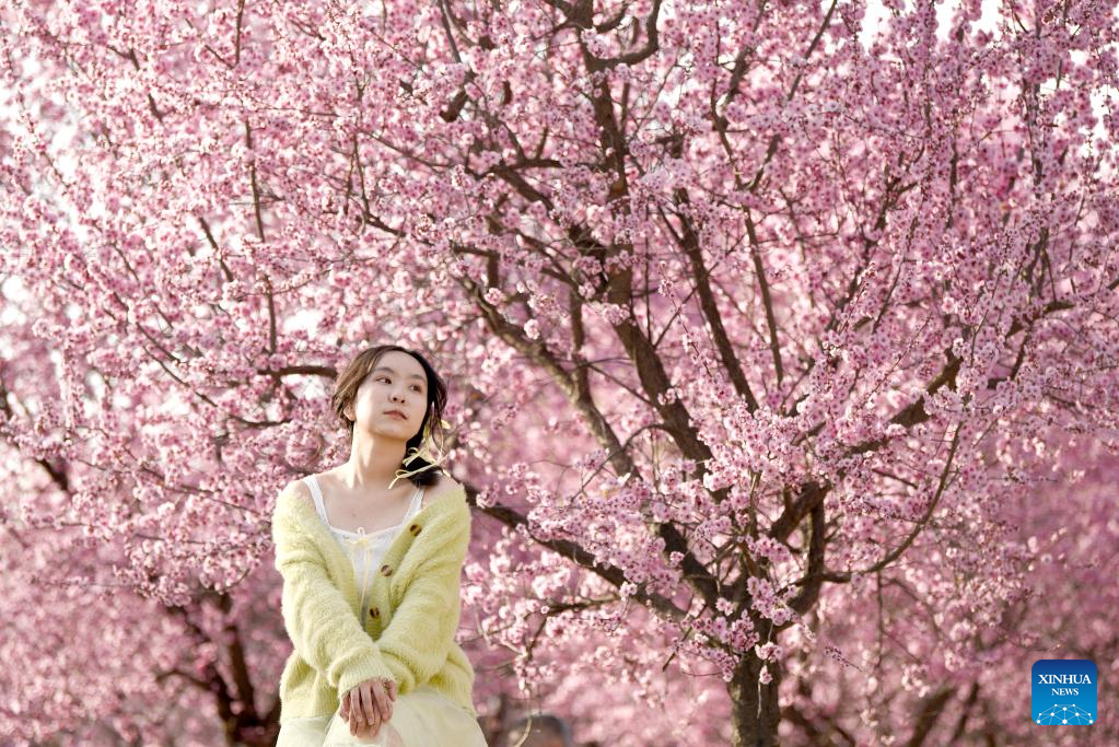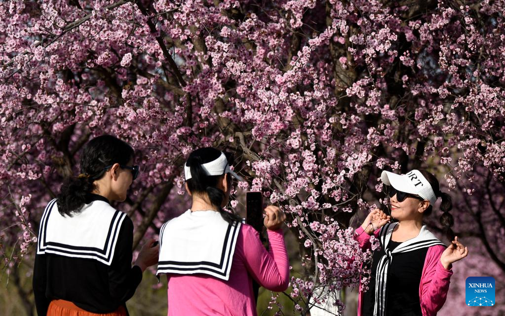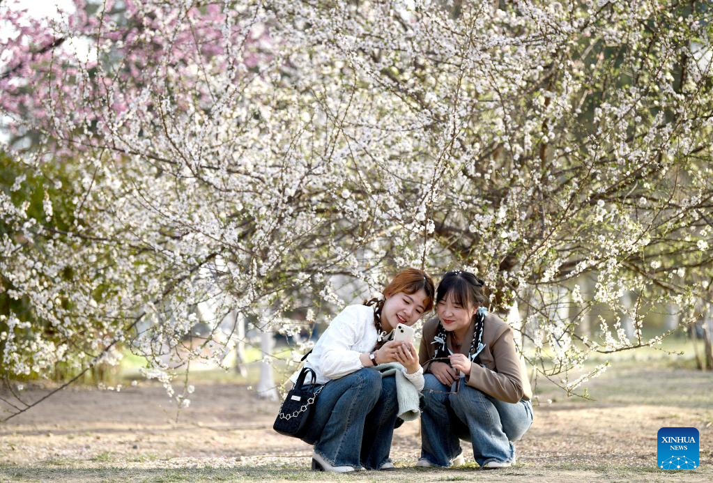 Women take pictures among blossoms at Daming Palace National Heritage Park in Xi'an, northwest China's Shaanxi Province, March 14, 2023. (Xinhua/Liu Xiao)