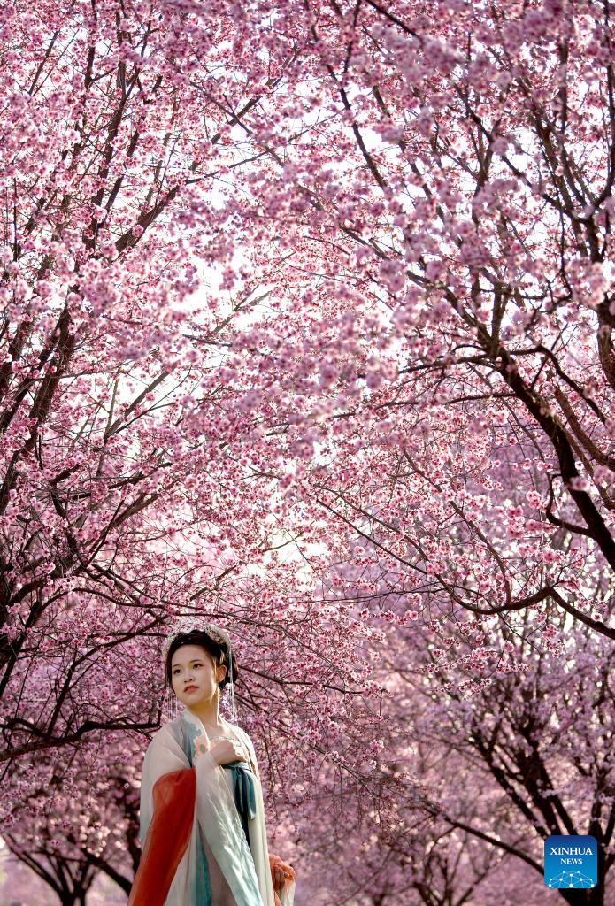 A woman in traditional costumes poses for pictures with spring flowers at Daming Palace National Heritage Park in Xi'an, northwest China's Shaanxi Province, March 14, 2023. (Xinhua/Liu Xiao)