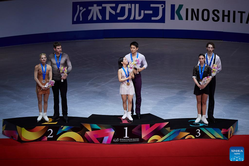Alexa Knierim (1st L)/Brandon Frazier (2nd L) of the United States, Miura Riku (bottom C)/Kihara Ryuichi (top C) of Japan, Sara Conti (2nd R)/Niccolo Macii (1st R) of Italy pose for photos after the pairs free skating at the ISU World Figure Skating Championships at Saitama Super Arena in Saitama, Japan, March 23, 2023. (Xinhua/Zhang Xiaoyu)