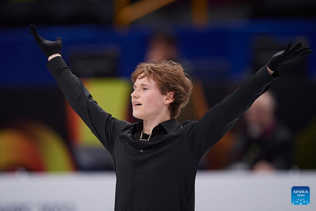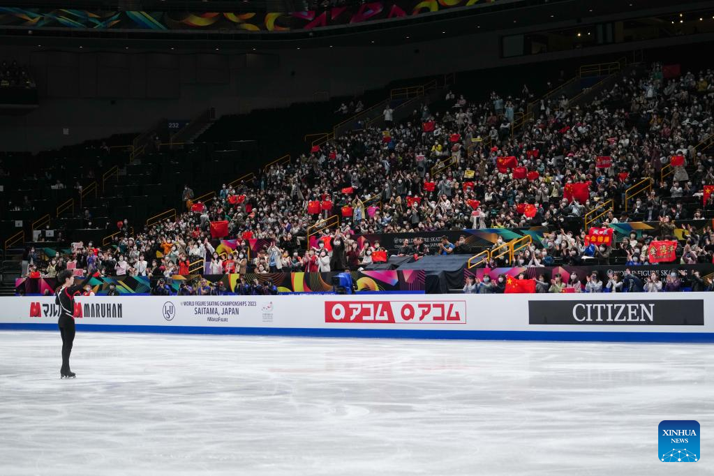Jin Boyang of China acknowledges the spectators after the men's short program at the ISU World Figure Skating Championships at Saitama Super Arena in Saitama, Japan, March 23, 2023. (Xinhua/Zhang Xiaoyu)