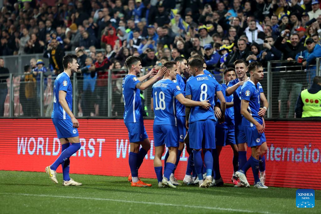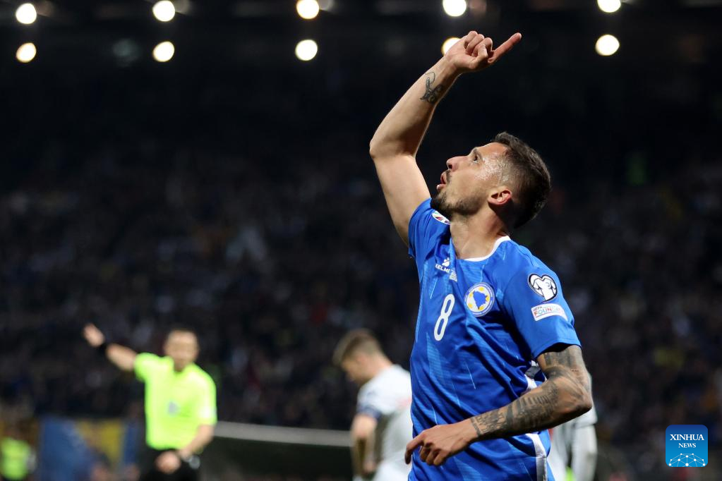 Players of Bosnia and Herzegovina celebrate scoring during the UEFA Euro 2024 Group J qualification match between Bosnia and Herzegovina and Iceland in Zenica, Bosnia and Herzegovina, March 23, 2023. (Photo by Ermin Zatega/Xinhua)
