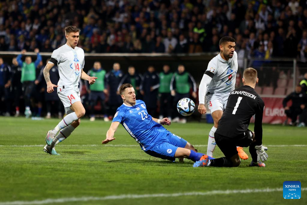 Ermedin Demirovic (2nd L) of Bosnia and Herzegovina competes during the UEFA Euro 2024 Group J qualification match between Bosnia and Herzegovina and Iceland in Zenica, Bosnia and Herzegovina, March 23, 2023. (Photo by Ermin Zatega/Xinhua)