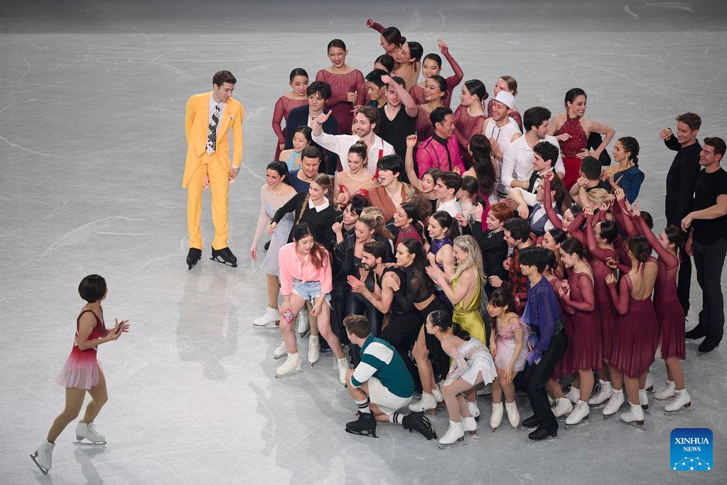 Skaters prepare for photos after the gala exhibition of ISU Wrold Figure Skating Championships held at Saitama Super Arena in Saitama, Japan, March 26, 2023. (Photo by Pablo Morano/Xinhua)