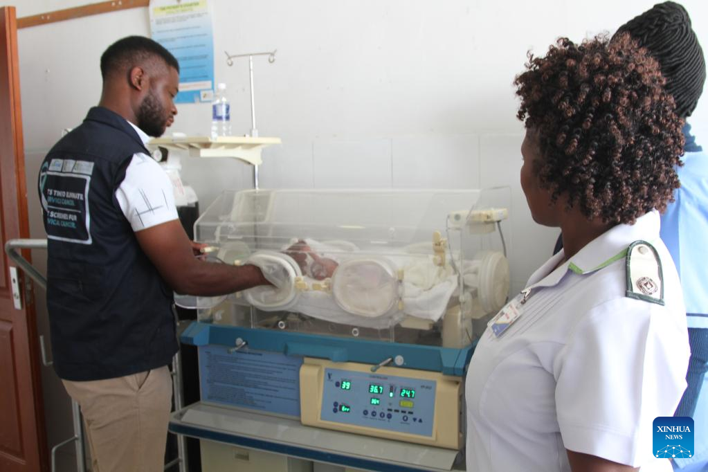 Marondera District Medical Officer Delight Madoro (L) inspects a new-born baby in an incubator at Mahusekwa Hospital in Mahusekwa, Mashonaland East Province, Zimbabwe, on March 24, 2023. (Xinhua/Zhang Baoping)