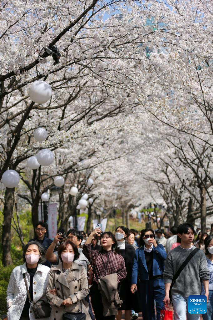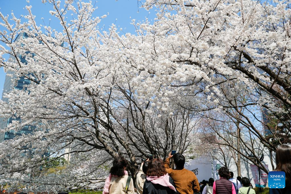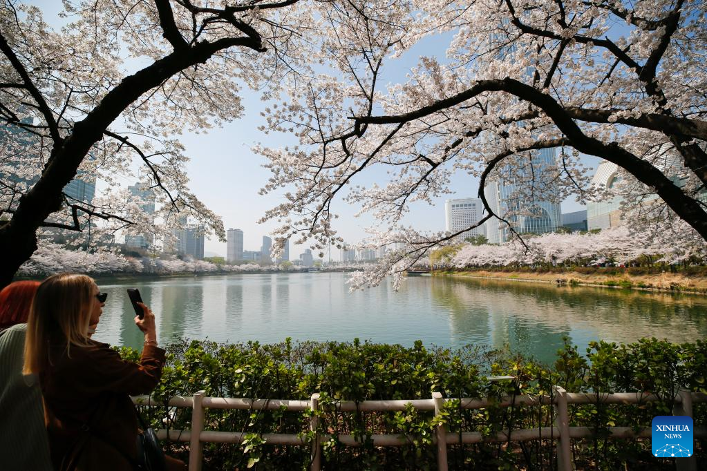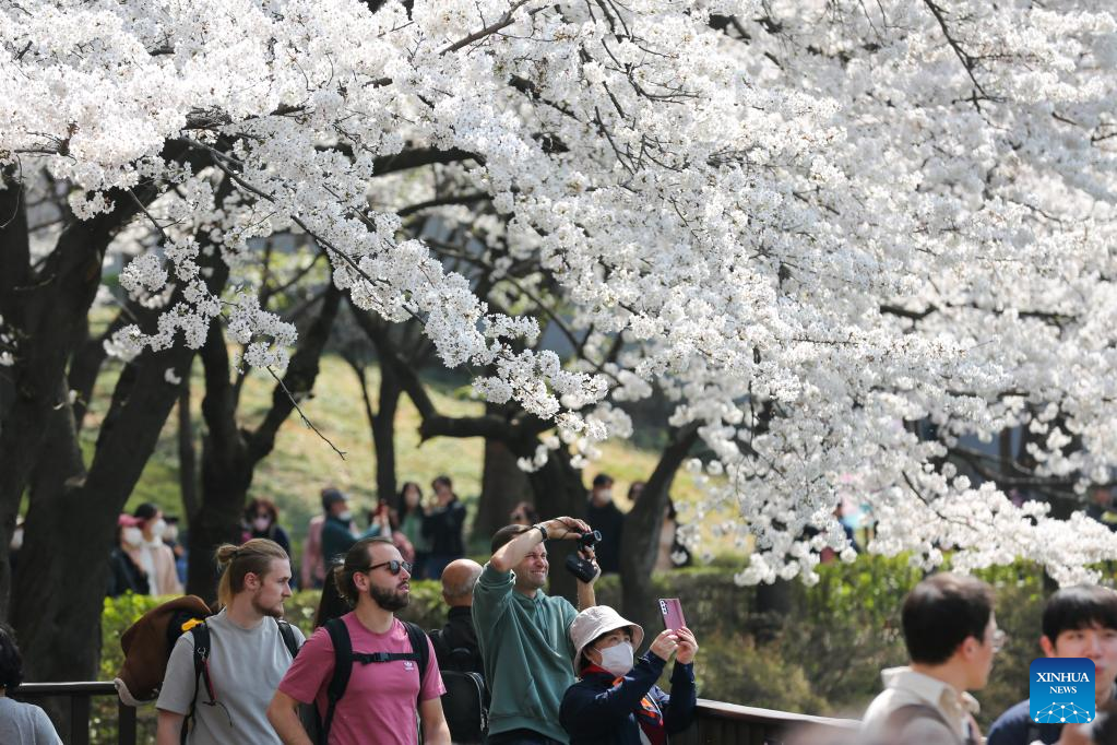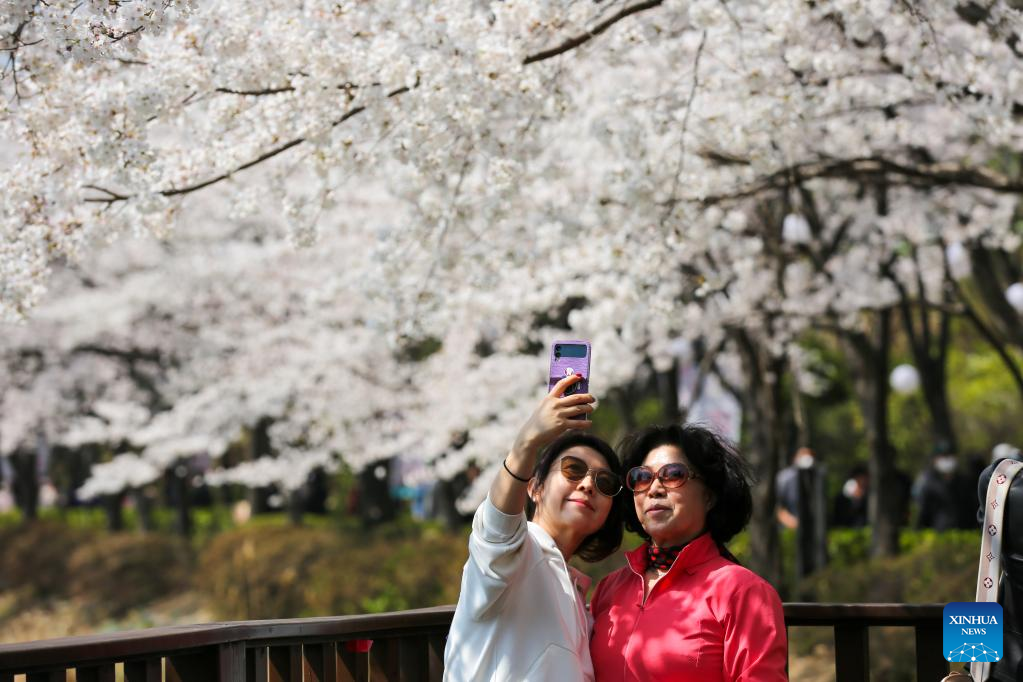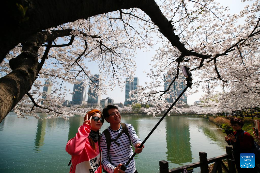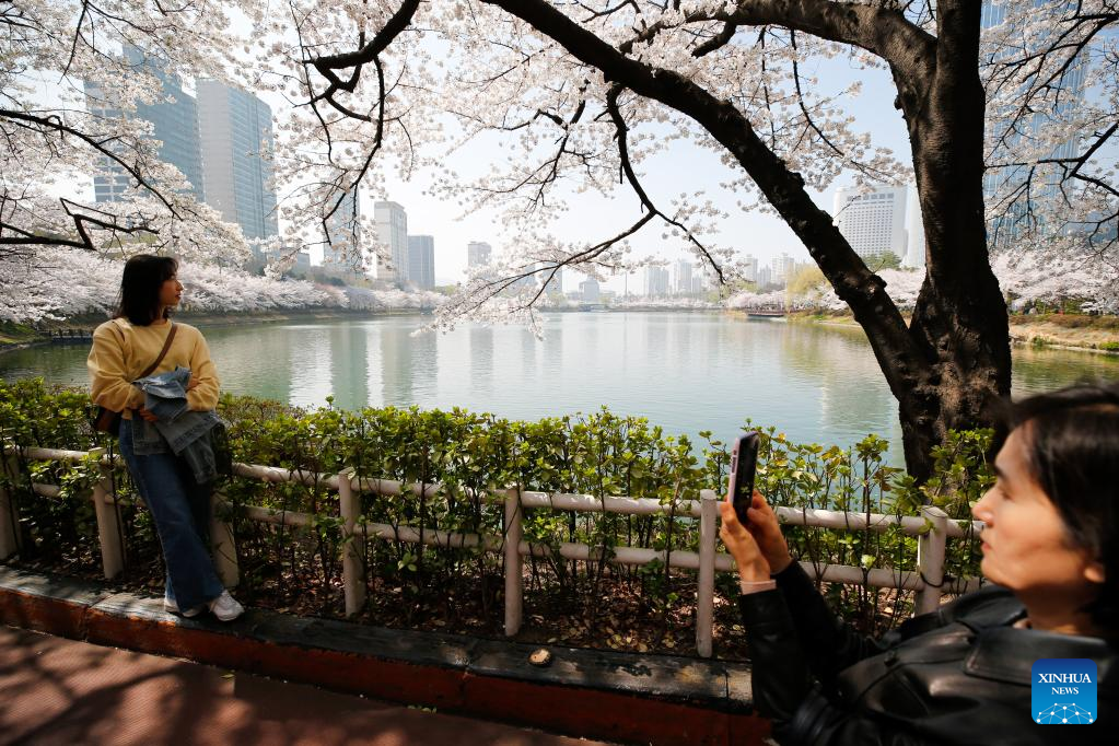 Tourists take photos of cherry blossoms at Seokchon Lake Park in Seoul, South Korea, March 30, 2023. (Xinhua/Wang Yiliang)