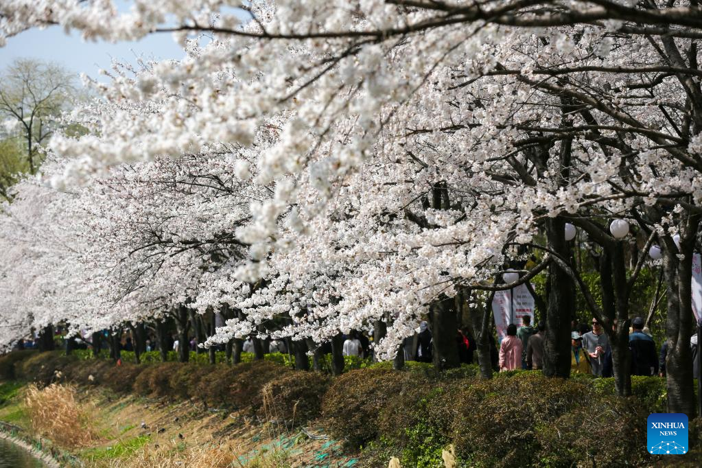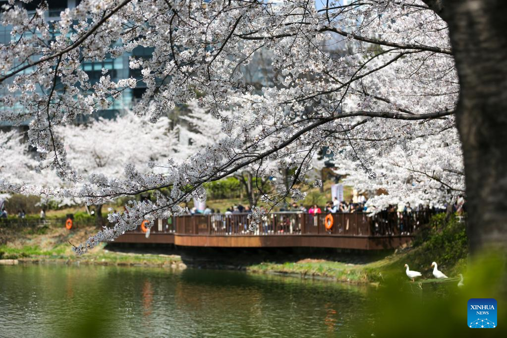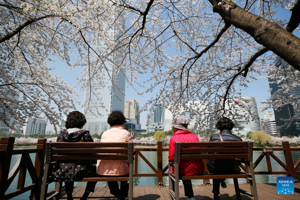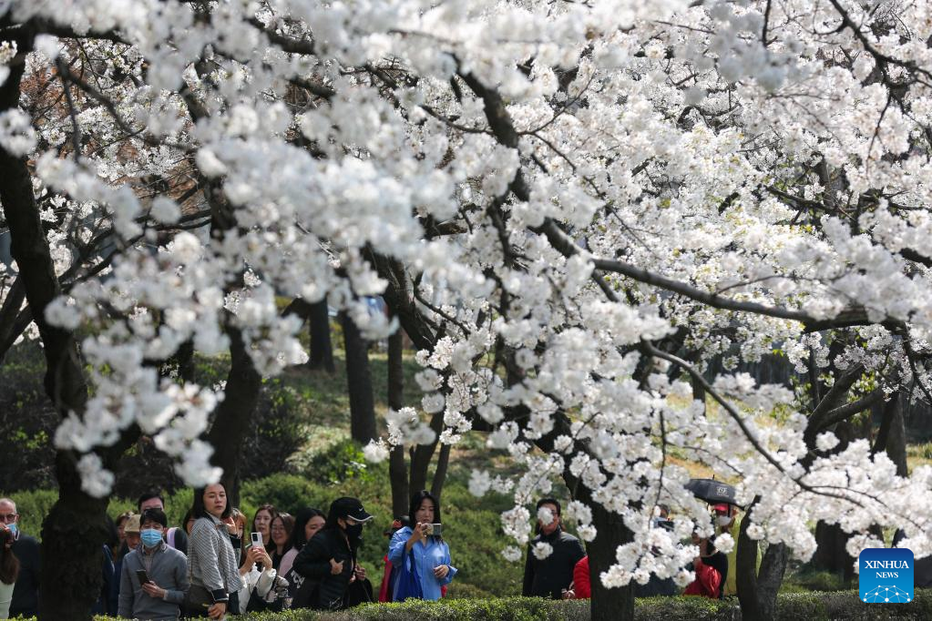 Tourists view cherry blossoms at Seokchon Lake Park in Seoul, South Korea, March 30, 2023. (Xinhua/Wang Yiliang)