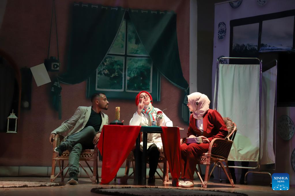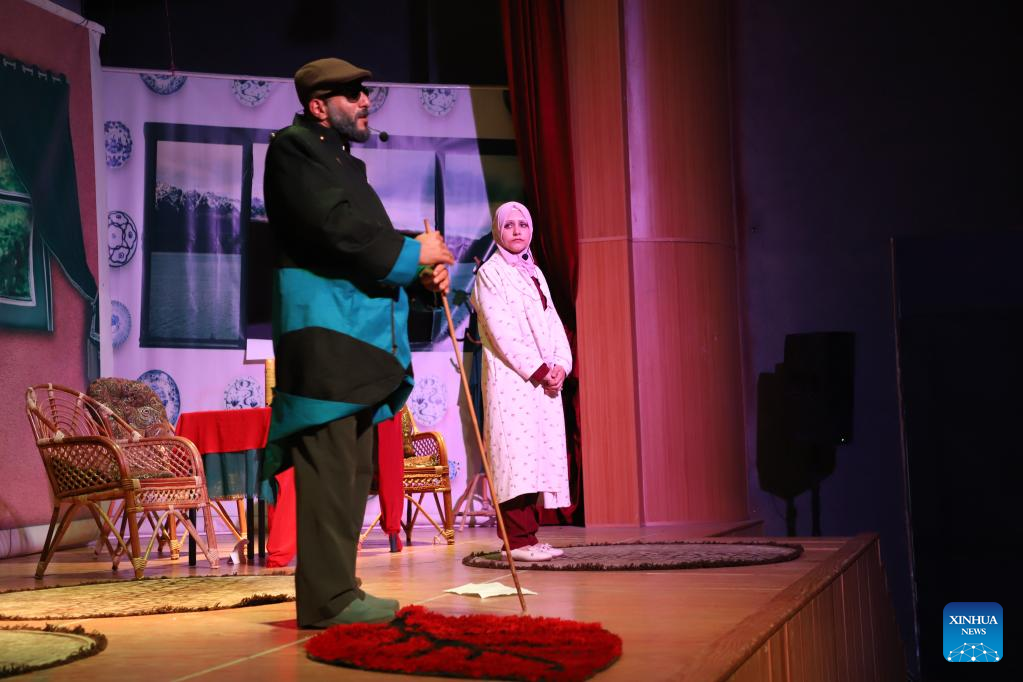 Palestinian actors perform at a theater in Gaza City, March 29, 2023. A group of Palestinian artists is trying to change social discrimination and violence in the local community through creative theater performances. (Photo by Rizek Abdeljawad/Xinhua)