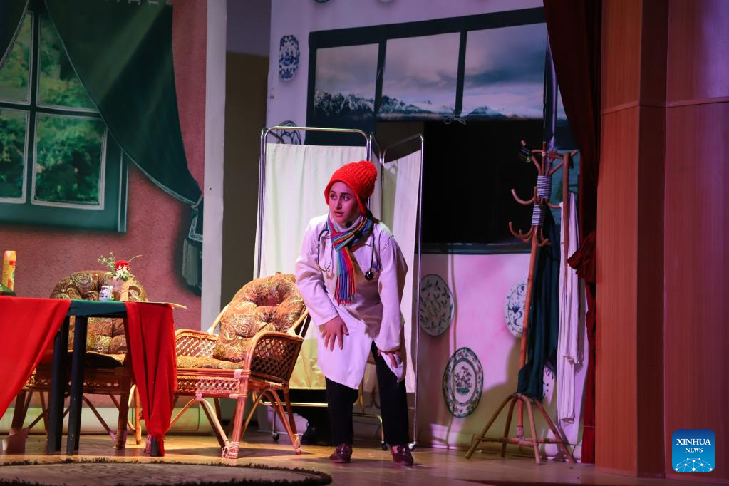 A Palestinian actress performs at a theater in Gaza City, March 29, 2023. A group of Palestinian artists is trying to change social discrimination and violence in the local community through creative theater performances. (Photo by Rizek Abdeljawad/Xinhua)