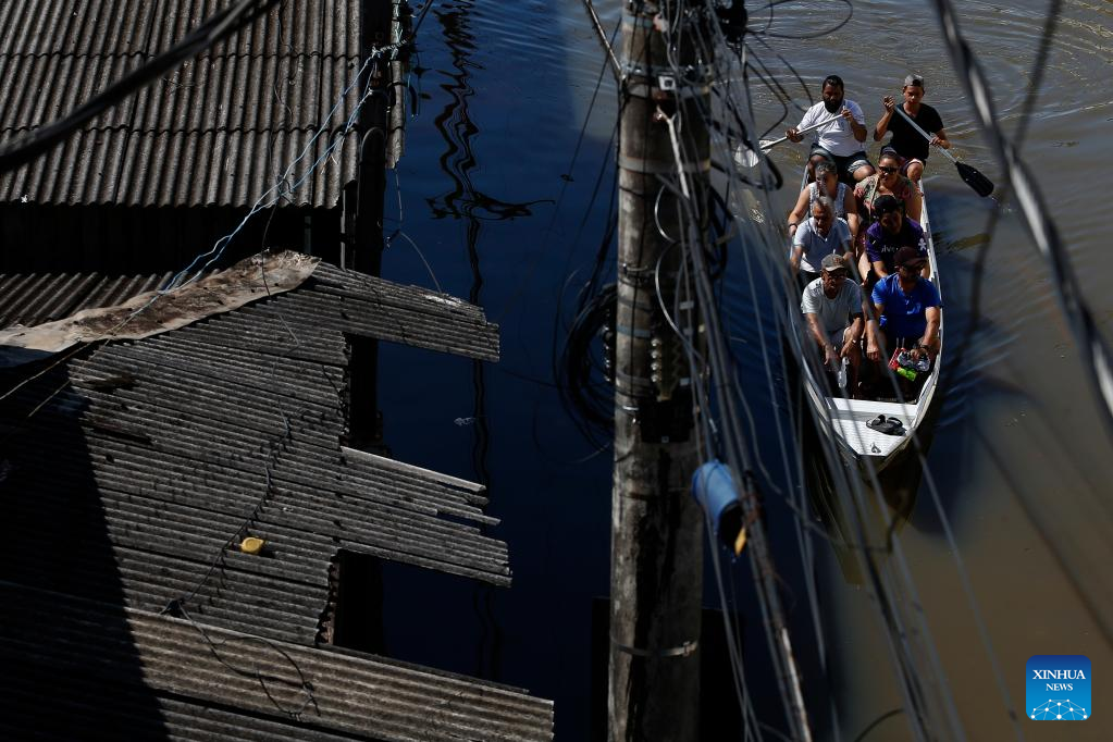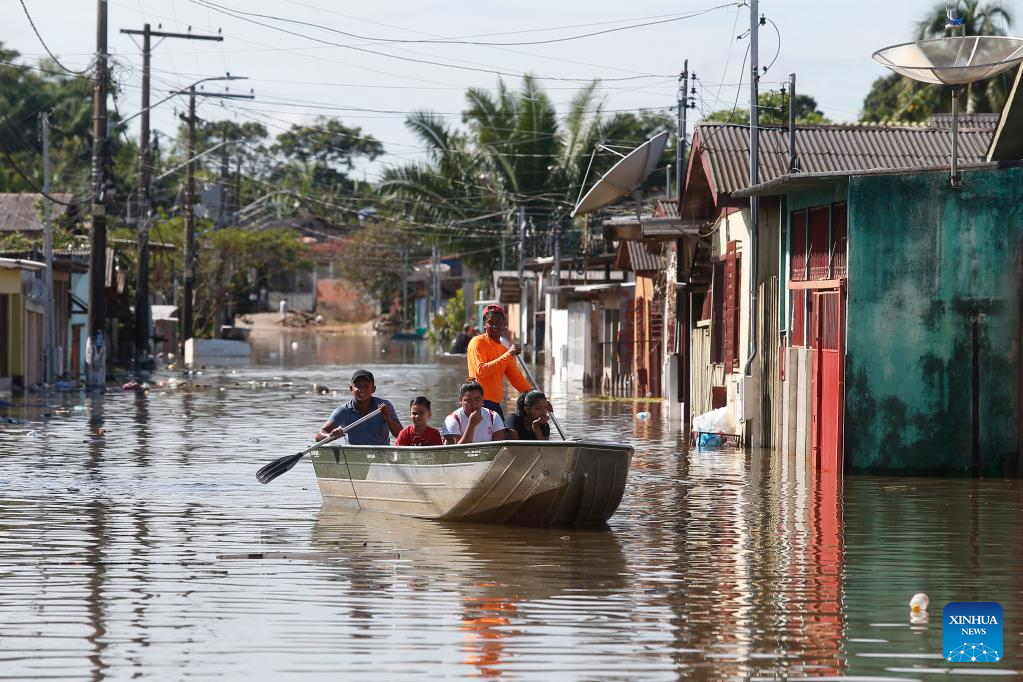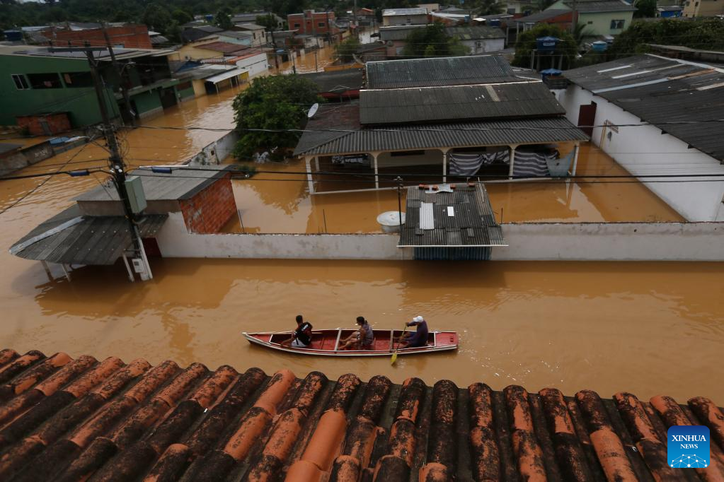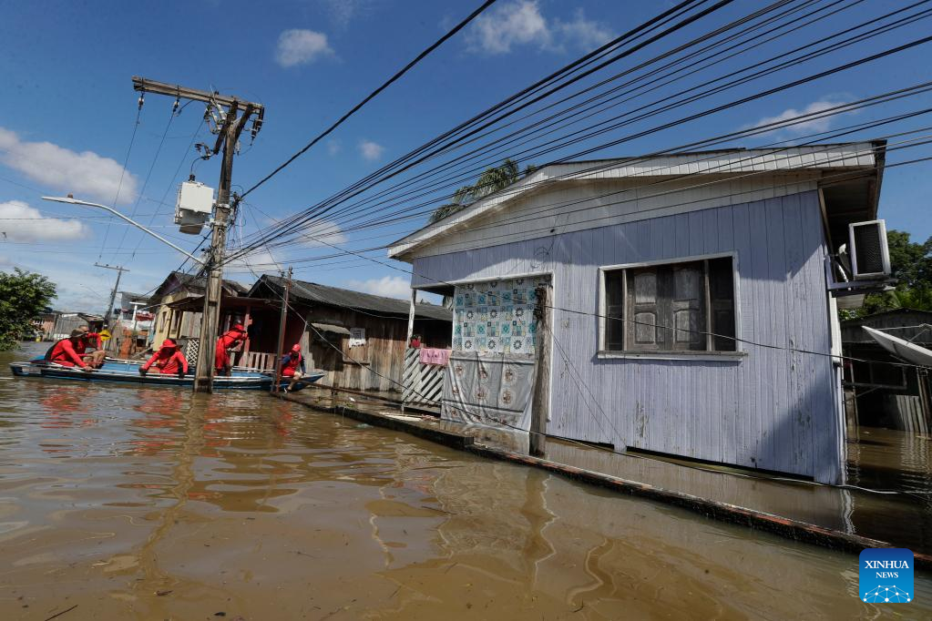 Residents take a boat after flood caused by heavy rainfall in Rio Branco, Brazil, March 30, 2023. The flood in the northwestern border region of Brazil directly affected the lives and property of local residents in the communities of Rio Branco and along the Acre River. (Photo by Lucio Tavora/Xinhua)