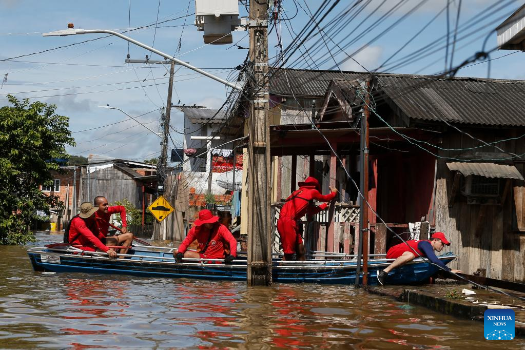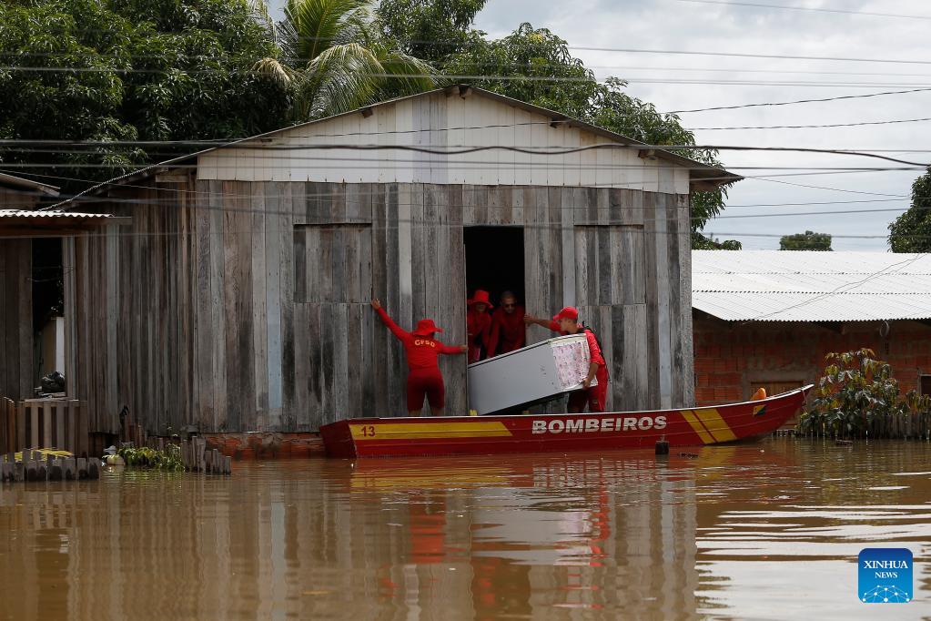 Rescuers search for victims after flood caused by heavy rainfall in Rio Branco, Brazil, March 30, 2023. The flood in the northwestern border region of Brazil directly affected the lives and property of local residents in the communities of Rio Branco and along the Acre River. (Photo by Lucio Tavora/Xinhua)