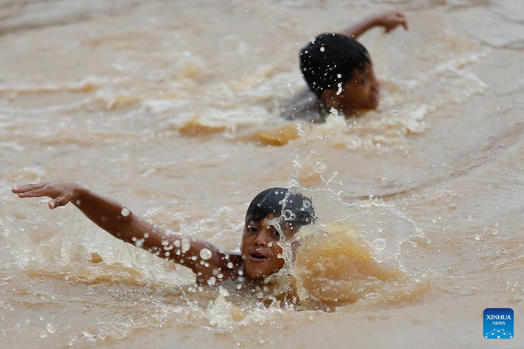 Boys swim in flooding water in Rio Branco, Brazil, March 31, 2023. The flood in the northwestern border region of Brazil directly affected the lives and property of local residents in the communities of Rio Branco and along the Acre River. (Photo by Lucio Tavora/Xinhua)