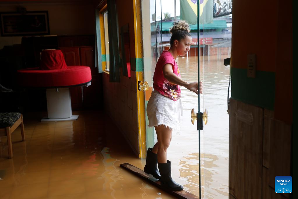 A woman checks on flooding water on the street in Rio Branco, Brazil, March 31, 2023. The flood in the northwestern border region of Brazil directly affected the lives and property of local residents in the communities of Rio Branco and along the Acre River. (Photo by Lucio Tavora/Xinhua)