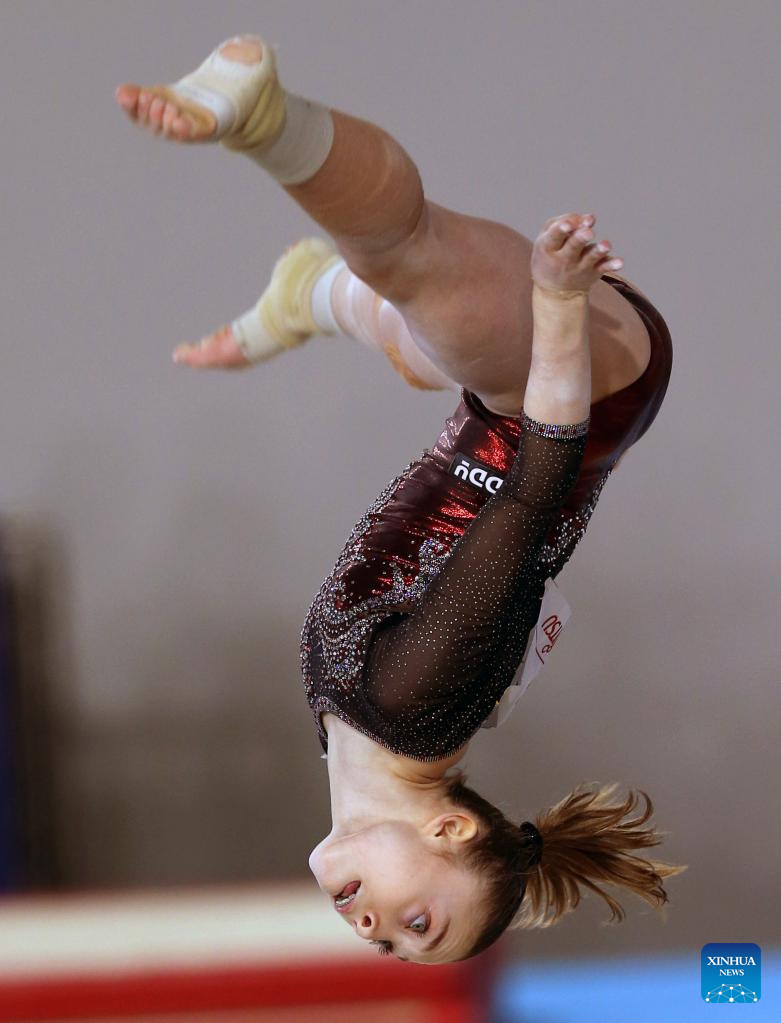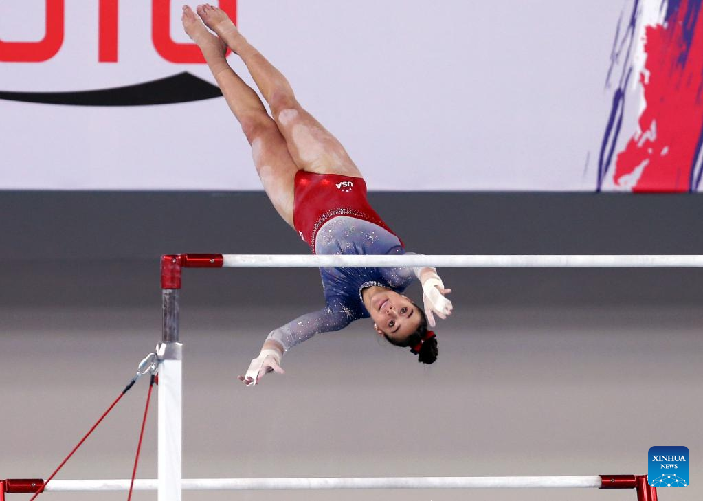 Isabel Stassi of the United States competes in the uneven bars competition of the women's team event at the 2nd Artistic Gymnastics Junior World Championships in Antalya, Türkiye, on March 30, 2023. (Photo by Mustafa Kaya/Xinhua)