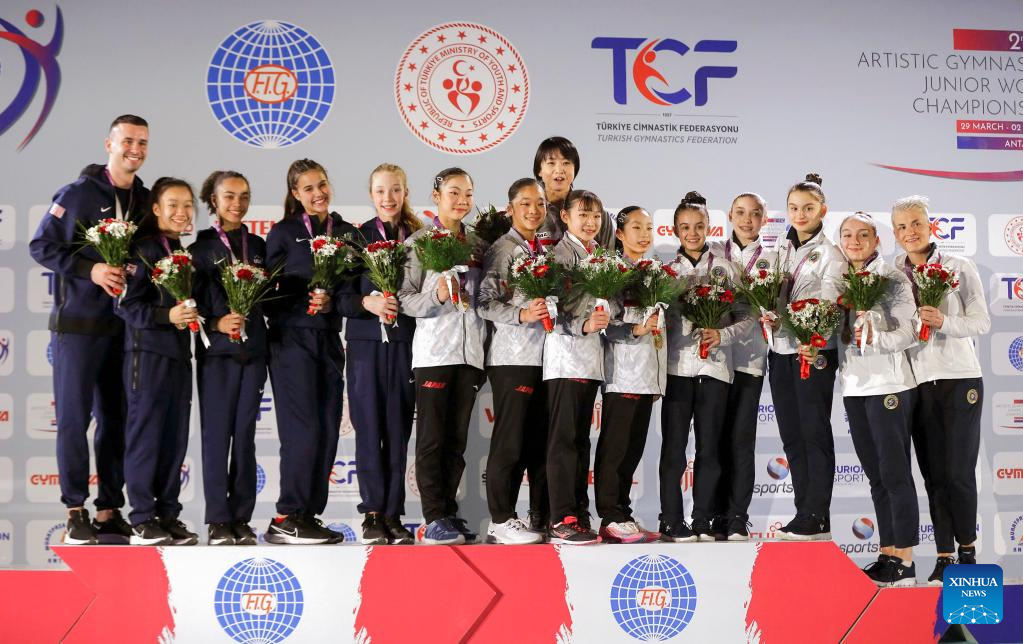 Gold medalists team Japan (C), silver medalists team the United States (L) and bronze medalists team Italy attend the awarding ceremony for the women's team event at the 2nd Artistic Gymnastics Junior World Championships in Antalya, Türkiye, on March 30, 2023. (Photo by Mustafa Kaya/Xinhua)