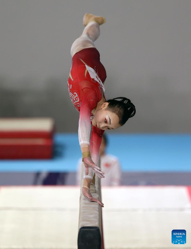 Qin Xinyi of China competes in the balance beam competition of the women's team event at the 2nd Artistic Gymnastics Junior World Championships in Antalya, Türkiye, on March 30, 2023. (Photo by Mustafa Kaya/Xinhua)