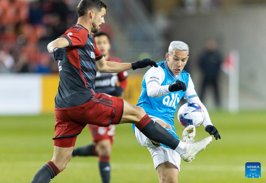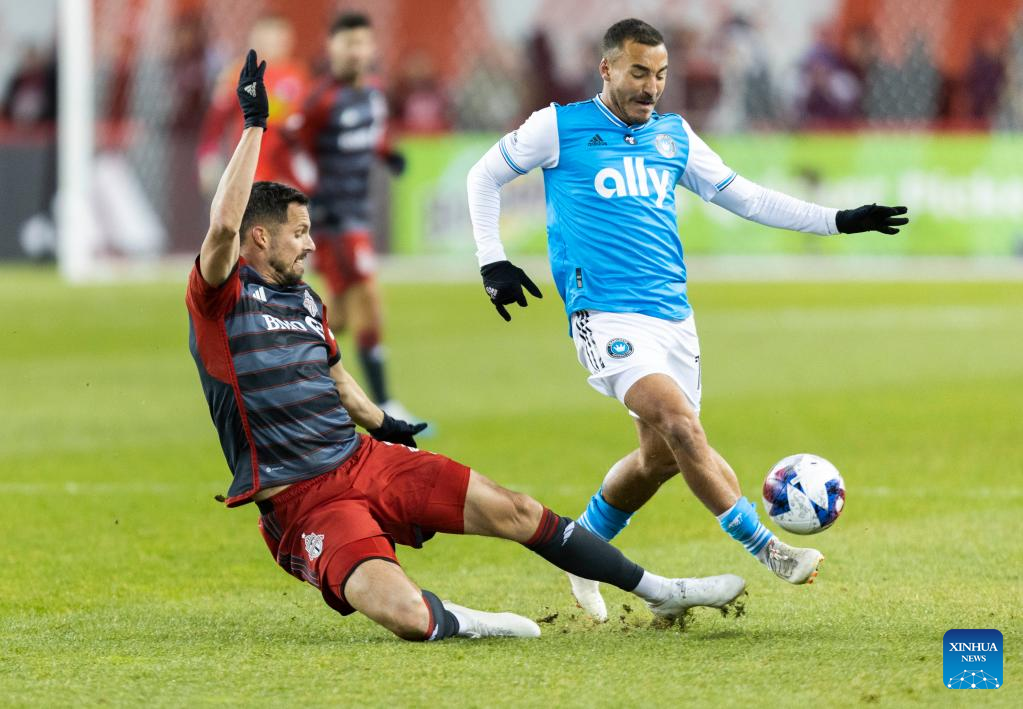 Matt Hedges (L) of Toronto FC vies with Enzo Copetti of Charlotte FC during their 2023 Major League Soccer (MLS) match at BMO Field in Toronto, Canada, on April 1, 2023. (Photo by Zou Zheng/Xinhua)